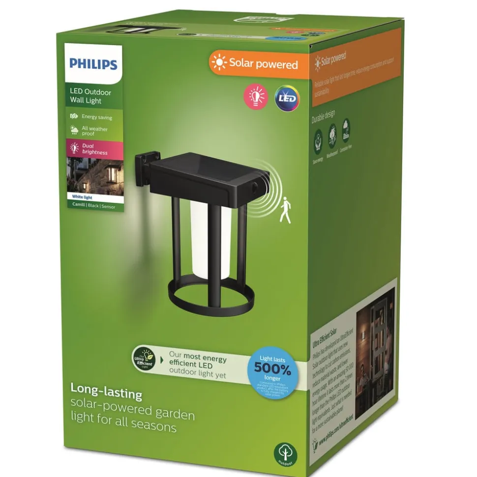 Camill LED-væglampe med bevægelses- og dagslyssensor – rund lanterneform Camill er en LED-solcellelampe, hvis batteri oplades i løbet af dagen ved hjælp af solenergi og derefter – når det er fuldt opladet – udsender stemningsfuldt, varmhvidt lys i ca. 35 timer. Den har en integreret dobbelt lysstyrkefunktion: Når den ikke er i brug, er lyset svagere; når der er mennesker til stede, bliver det automatisk lysere. Udstyret med bevægelses- og dagslyssensor.