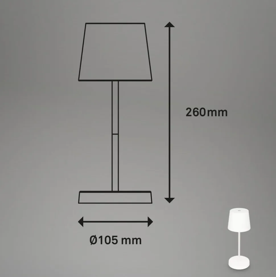 LED-bordlampe Piha med touch-dæmper, genopladeligt batteri og ladekabel (USB)LED-bordlampen Piha giver stemningsfuld, varmhvid belysning helt uden irriterende kabler takket være det integrerede genopladelige batteri. Med IP44-beskyttelse mod vandsprøjt og snavs kan den også placeres udenfor og give hyggeligt lys på terrassen, altanen og selv fjerntliggende områder i haven. Ved at berøre toppen af skærmen flere gange kan lysintensiteten skiftes til tre lysstyrkeniveauer. Lampen kan genoplades via det medfølgende USB-C-ladekabel (uden strømforsyningsenhed) med en længde på 50 cm.