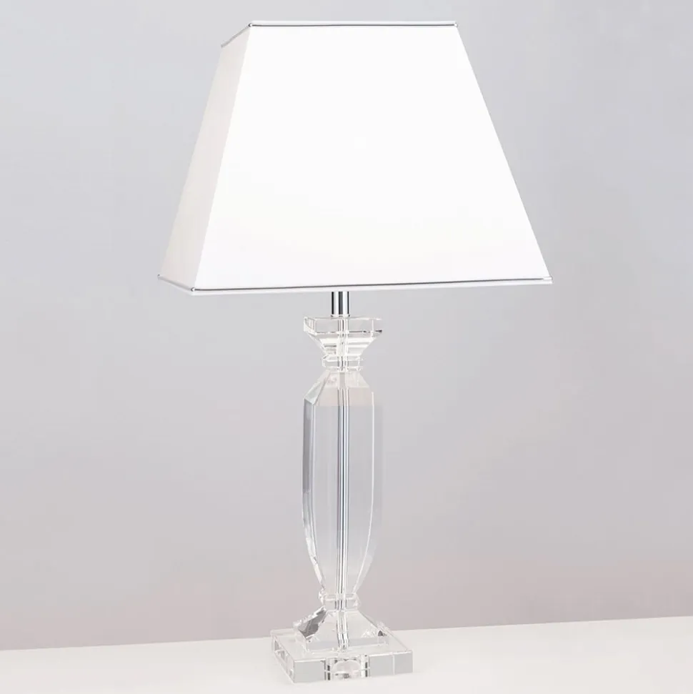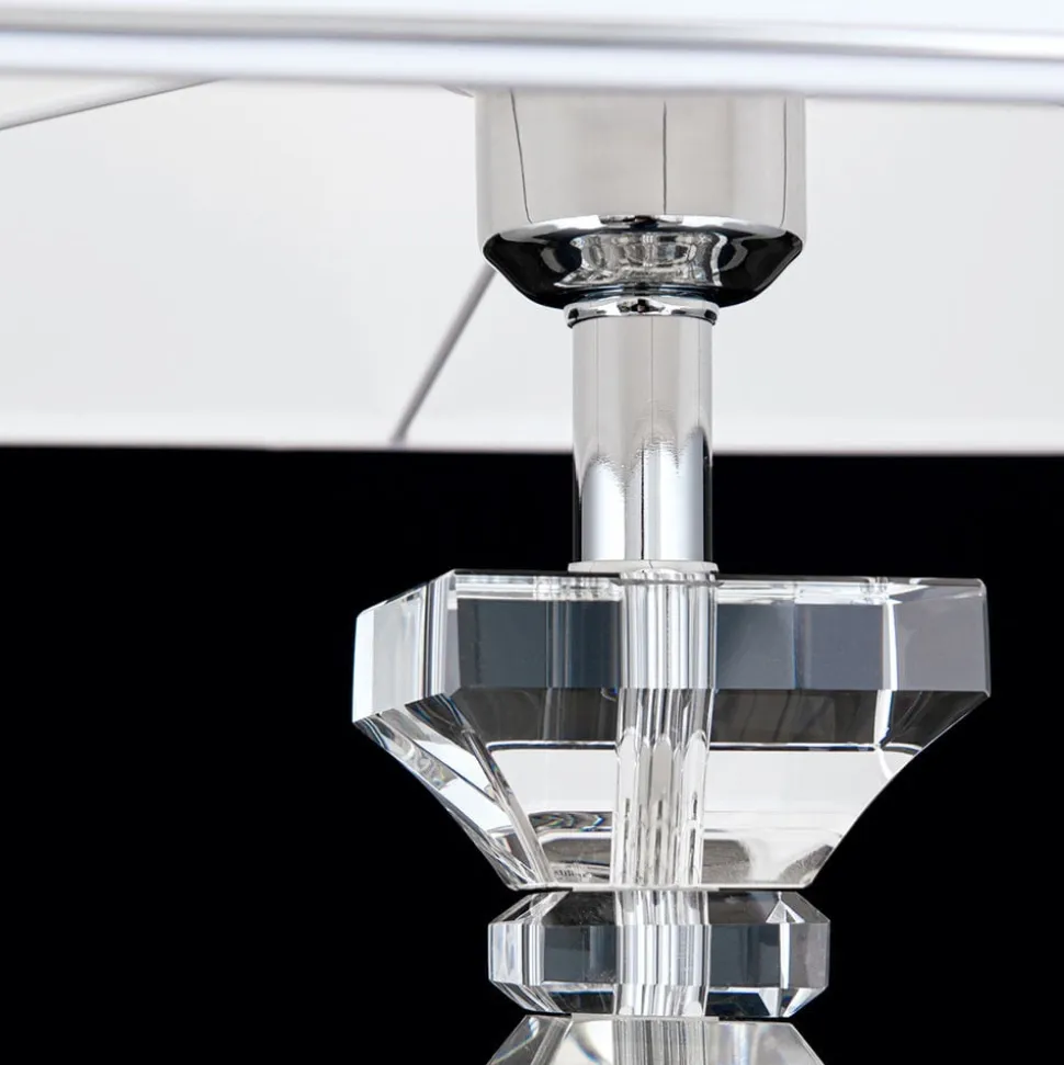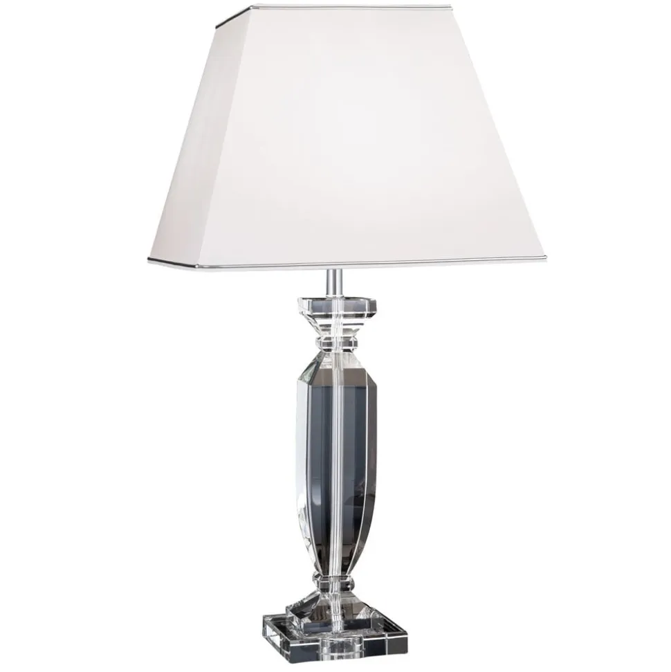 Denne bordlampe er ideel til at fuldende en sofistikeret indretningsstil. Selv når den ikke er oplyst, skiller den sig ud med sit ædle udseende på ethvert sted i stuen eller soveværelset. Dens hvide skærm af chintz er kantet og har en kromfarvet kant i den nederste kant, som opfanger farven på den stangramme, som skærmen sidder på. Denne kromfarvede stav er særlig effektiv, fordi den er omgivet af gennemsigtig K9-krystal, som også udgør basen. Stikket og kontakten er også gennemsigtige. En fornem kombination af farver og materialer, som imponerende sættes i scene af det udstrålende lys.