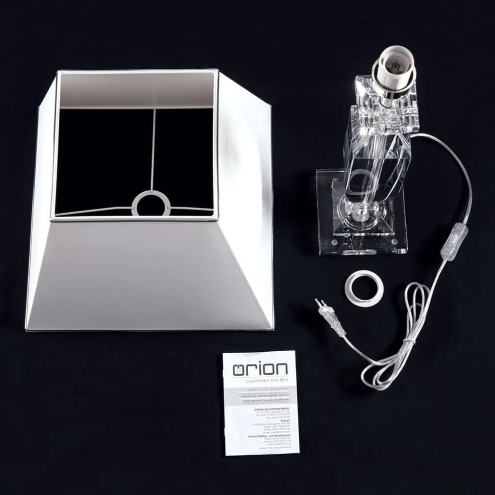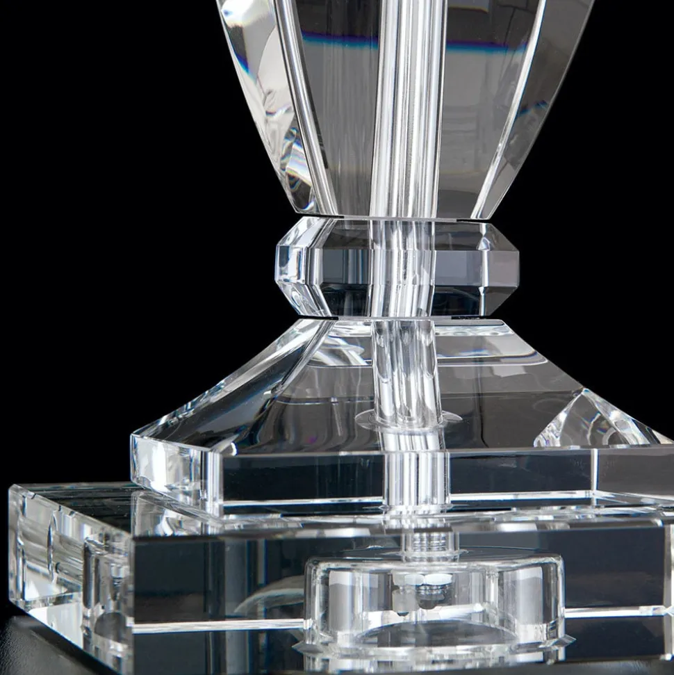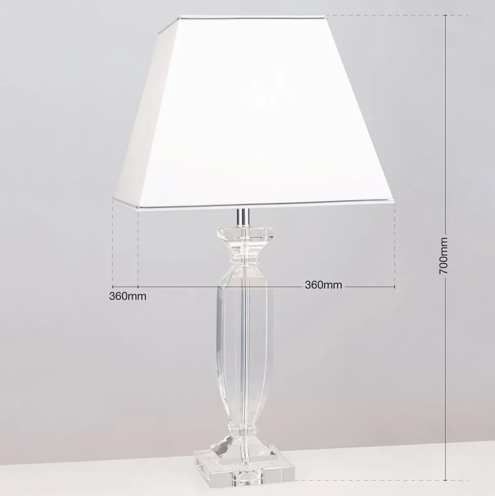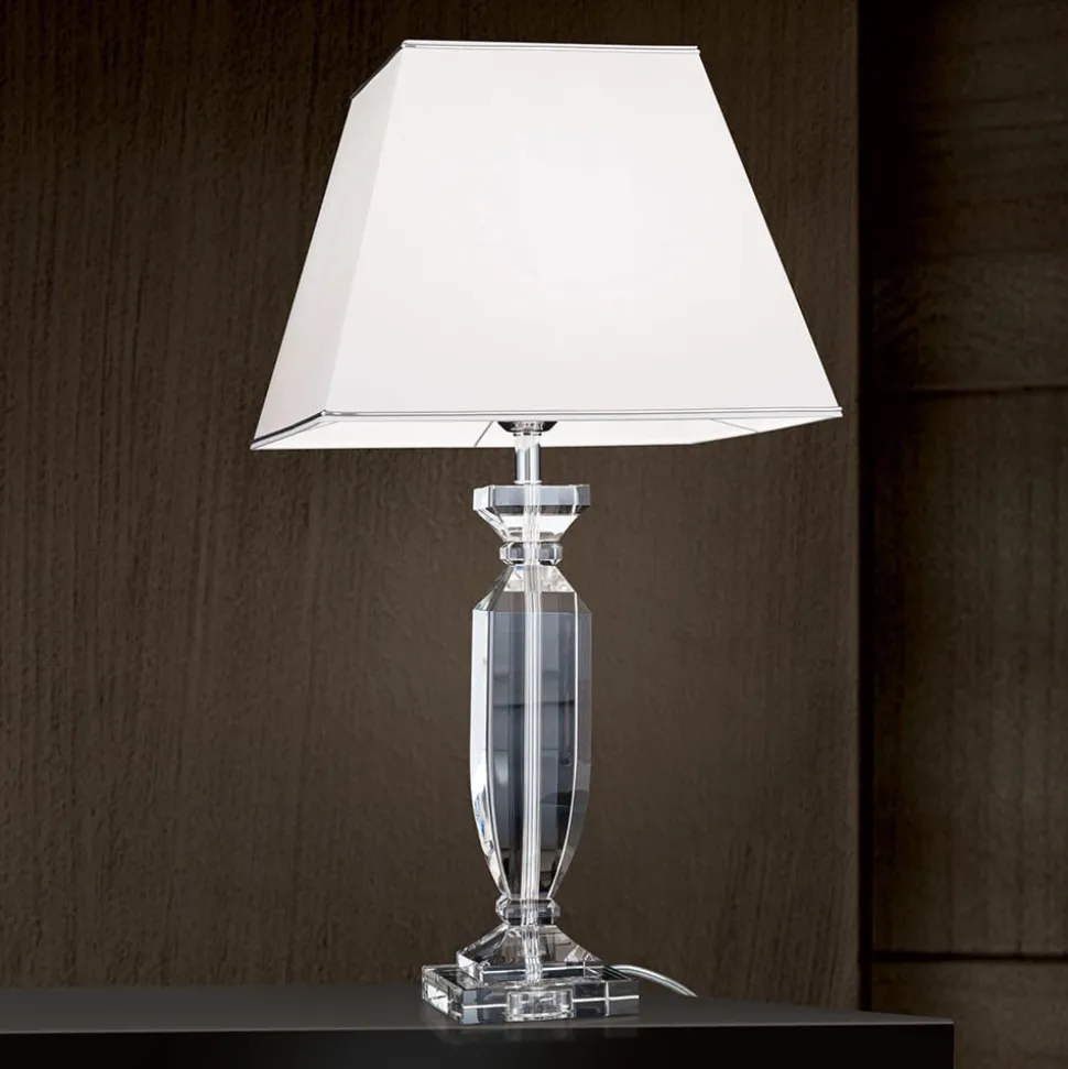 Denne bordlampe er ideel til at fuldende en sofistikeret indretningsstil. Selv når den ikke er oplyst, skiller den sig ud med sit ædle udseende på ethvert sted i stuen eller soveværelset. Dens hvide skærm af chintz er kantet og har en kromfarvet kant i den nederste kant, som opfanger farven på den stangramme, som skærmen sidder på. Denne kromfarvede stav er særlig effektiv, fordi den er omgivet af gennemsigtig K9-krystal, som også udgør basen. Stikket og kontakten er også gennemsigtige. En fornem kombination af farver og materialer, som imponerende sættes i scene af det udstrålende lys.