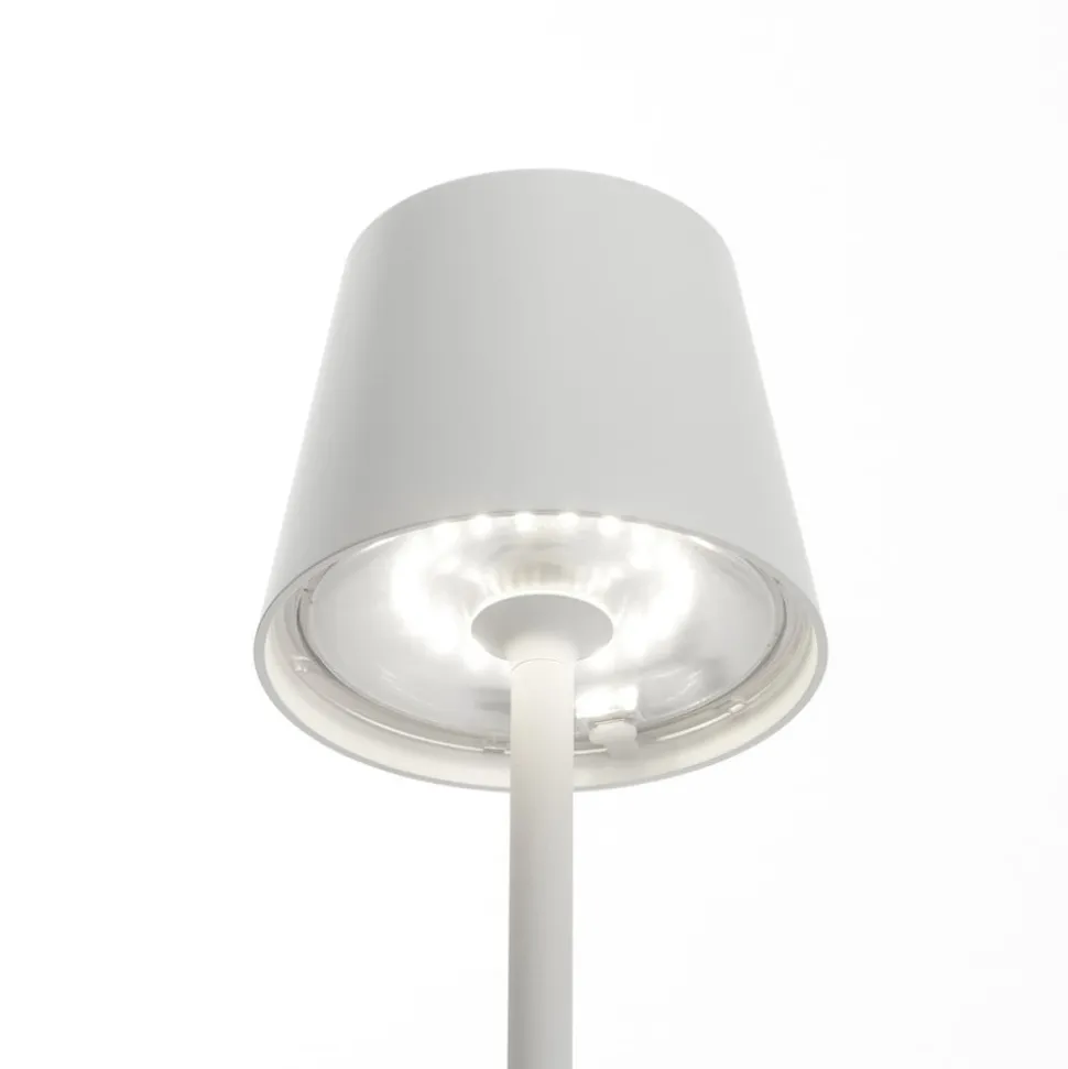 Poldina sætter lysakcenter, hvor der er brug for det, for takket være batteridrift giver den ca. 9 timers lys og kan takket være IP54-beskyttelse både indendørs og udendørs anbringes i blomsterpotter eller direkte i jorden. Opladning sker via USB-porten på undersiden af skærmen. LED’erne tændes og slukkes via touch-dæmpningskontakten på oversiden af lampen. Lysstyrken på lampen kan også reguleres efter ønske via denne kontakt, og det er muligt at skifte lysfarven mellem 2.700 K og 3.000 K.
