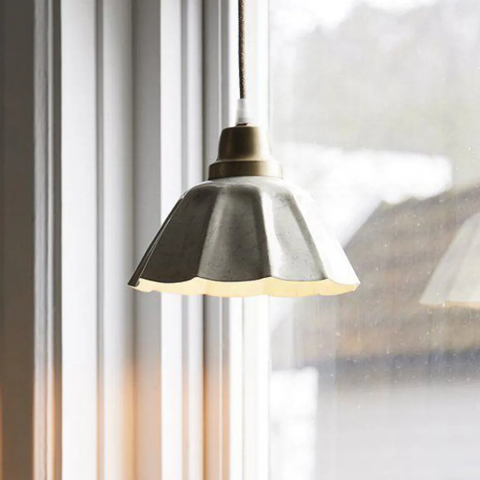 Den runde, åbne lampeskærm på hængelampen Ester i jern har en farvet emaljeret finish. Kombineret med de messingfarvede detaljer over lampeskærmen skaber det en lampe med en tiltalende vintage charme. Strømforsyningen sker direkte via en stikkontakt; hængelampen Ester er derfor udstyret med et stik med fastgørelseskroge.