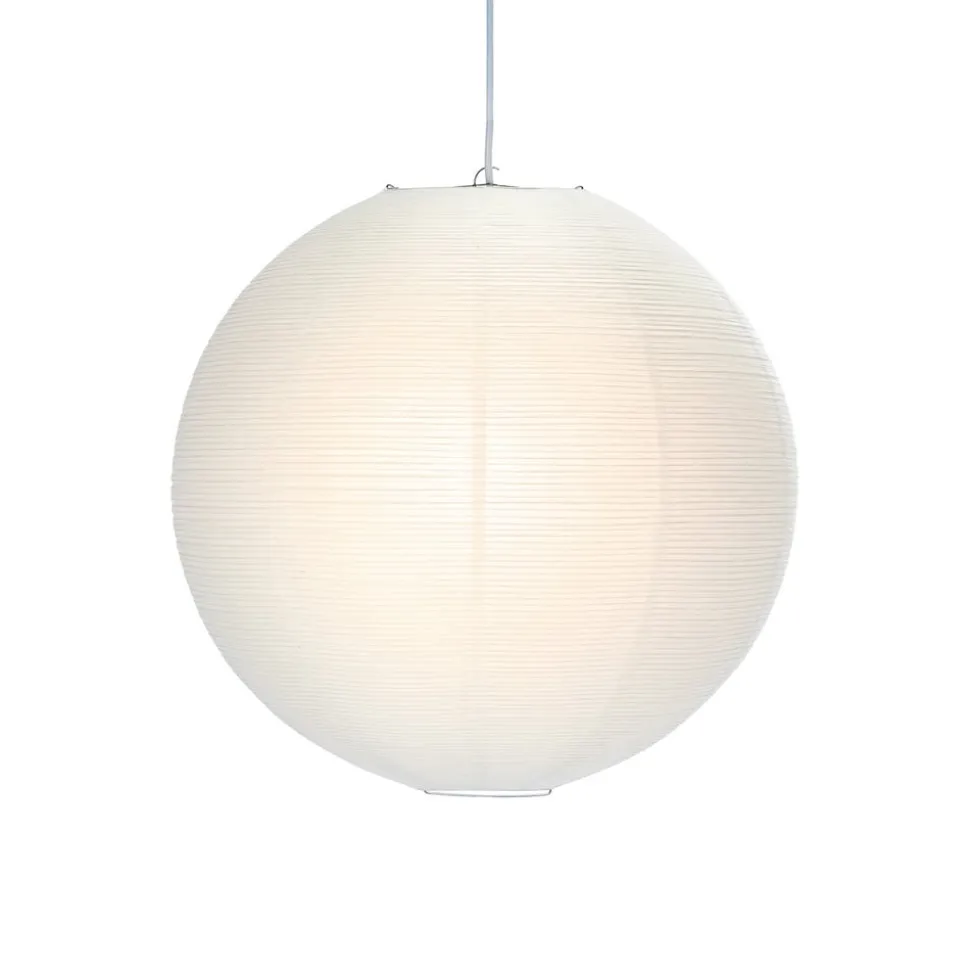 Hvid, kugleformet Haru hængelampe lavet af rispapir Haru hængelampen er designet i japansk stil med uregelmæssig, tæt ståltråd, der skaber et smukt mønster. Papirskærmen blokerer helt for det udsendte lys og skaber et harmonisk, jævnt lys i rummet.