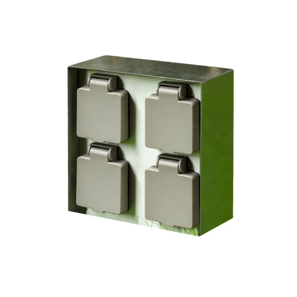 Foranda energisøjle i rustfrit stål med fire stikkontakter, praktisk til udendørs brug
