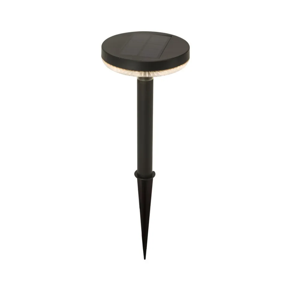 Rund, sort LED-solcellelampe Glenios til haver og indkørsler Denne solcellelampe giver et blidt orienteringslys omkring huset og drives af LED’er. En ekstern strømkilde er ikke nødvendig for driften, da det daglige sollys rammer solpanelet og sørger for, at lampen kan oplade batterierne igen og igen. Når de er fuldt opladet, kan LED-solcellelampen lyse i op til 16 timer. Det sorte, runde design passer til mange miljøer, og jordspyddet kan stikkes ned i mange typer jord, hvor det så vil få godt fat, hvad enten det er et blomsterbed, en græsplæne eller en plantekasse. Det er især effektivt, når flere af solcellelamperne bruges tæt på hinanden og skaber et hav af lyspunkter.