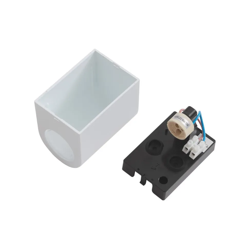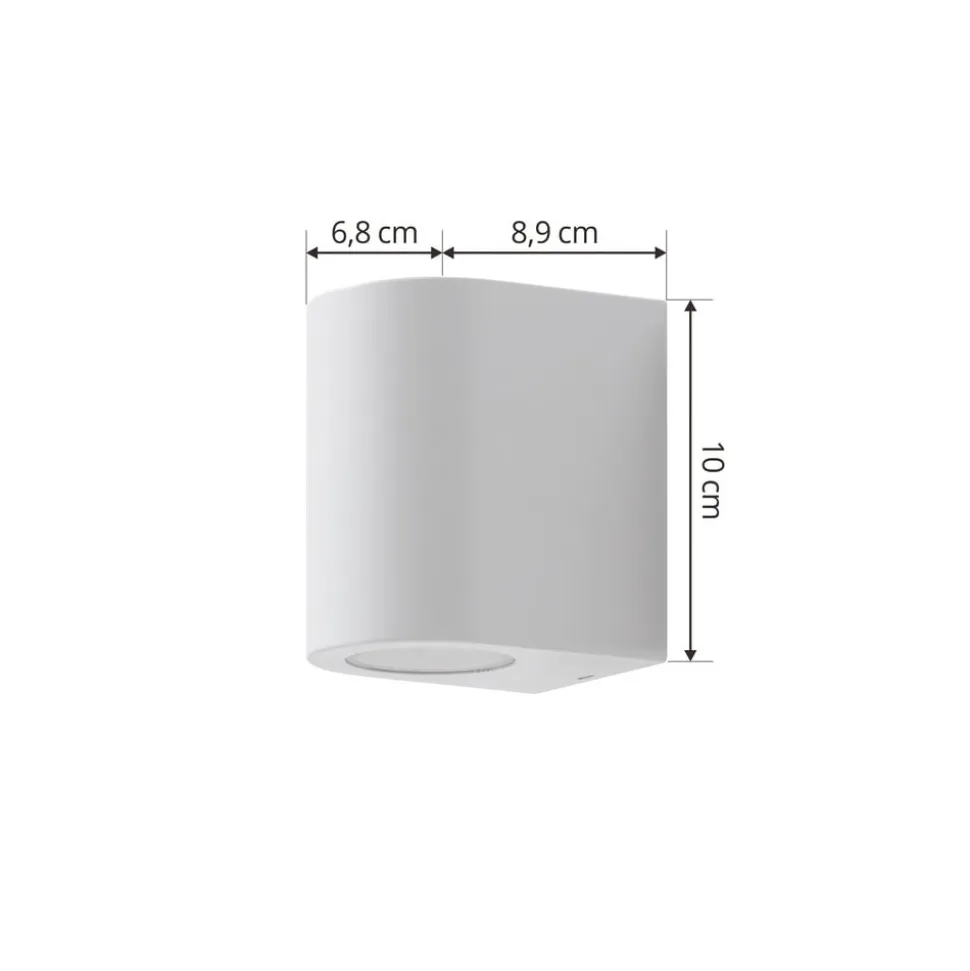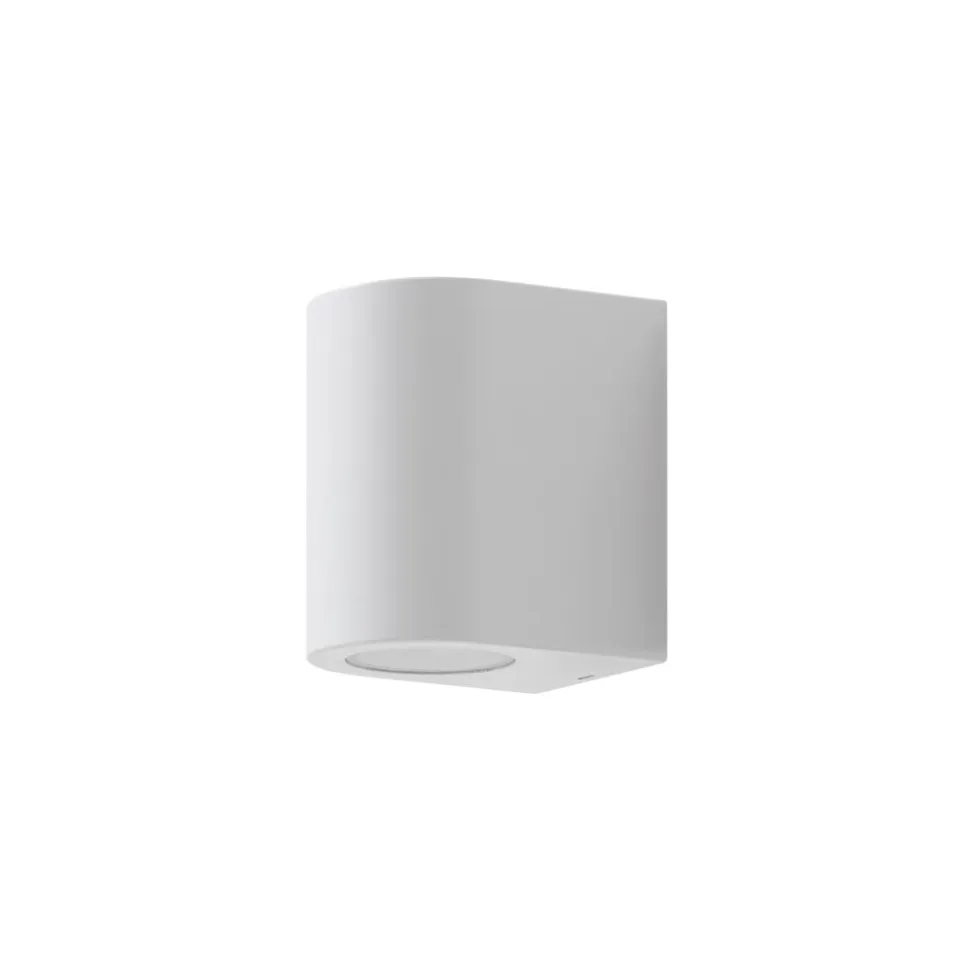 Hvid Irfan udendørs væglampe med afrundet hus Takket være sin hvide farve og enkle form integreres Irfan udendørs væglampe let i husets arkitektoniske stil uden at bryde den. Den er lavet af plast og har en diskret hvid finish. Den kan udstyres med en GU10-lyskilde, hvis lys udsendes fra undersiden af huset. Det giver en blændfri belysning. Kapslingsgraden IP44 betyder, at Irfan udendørs væglampe er beskyttet mod vandsprøjt.