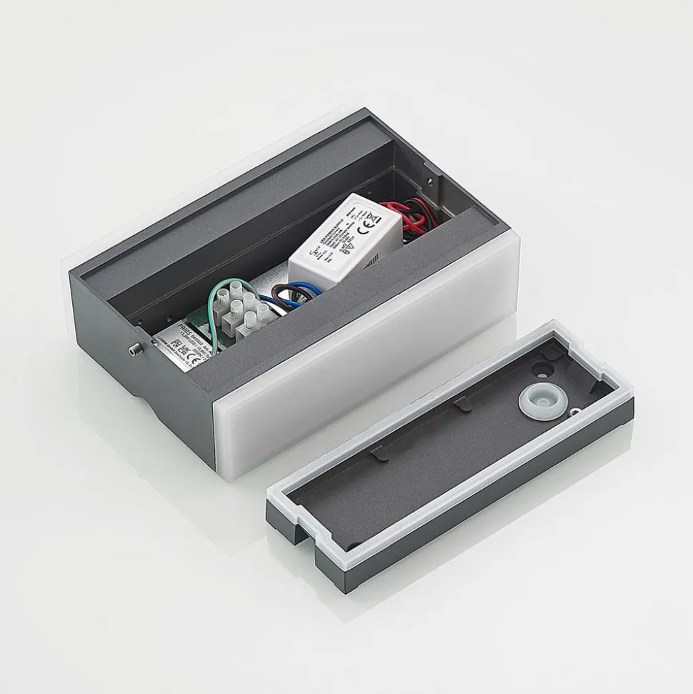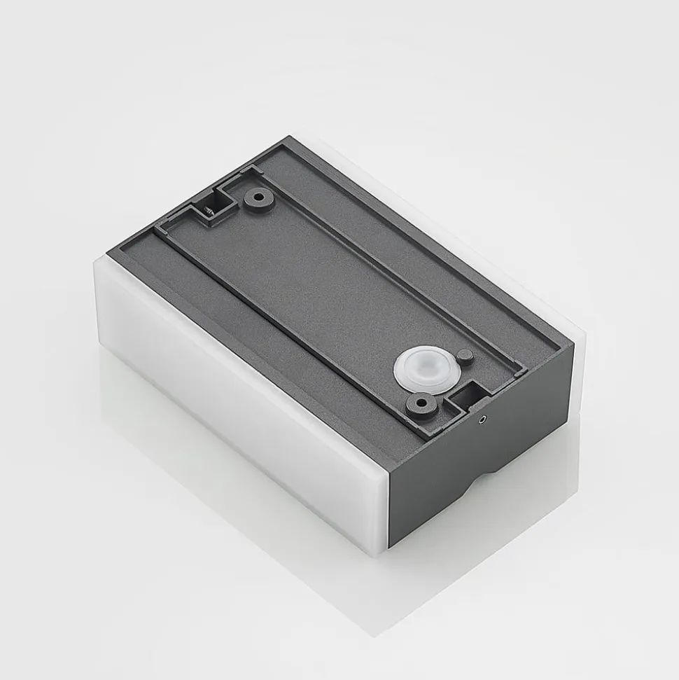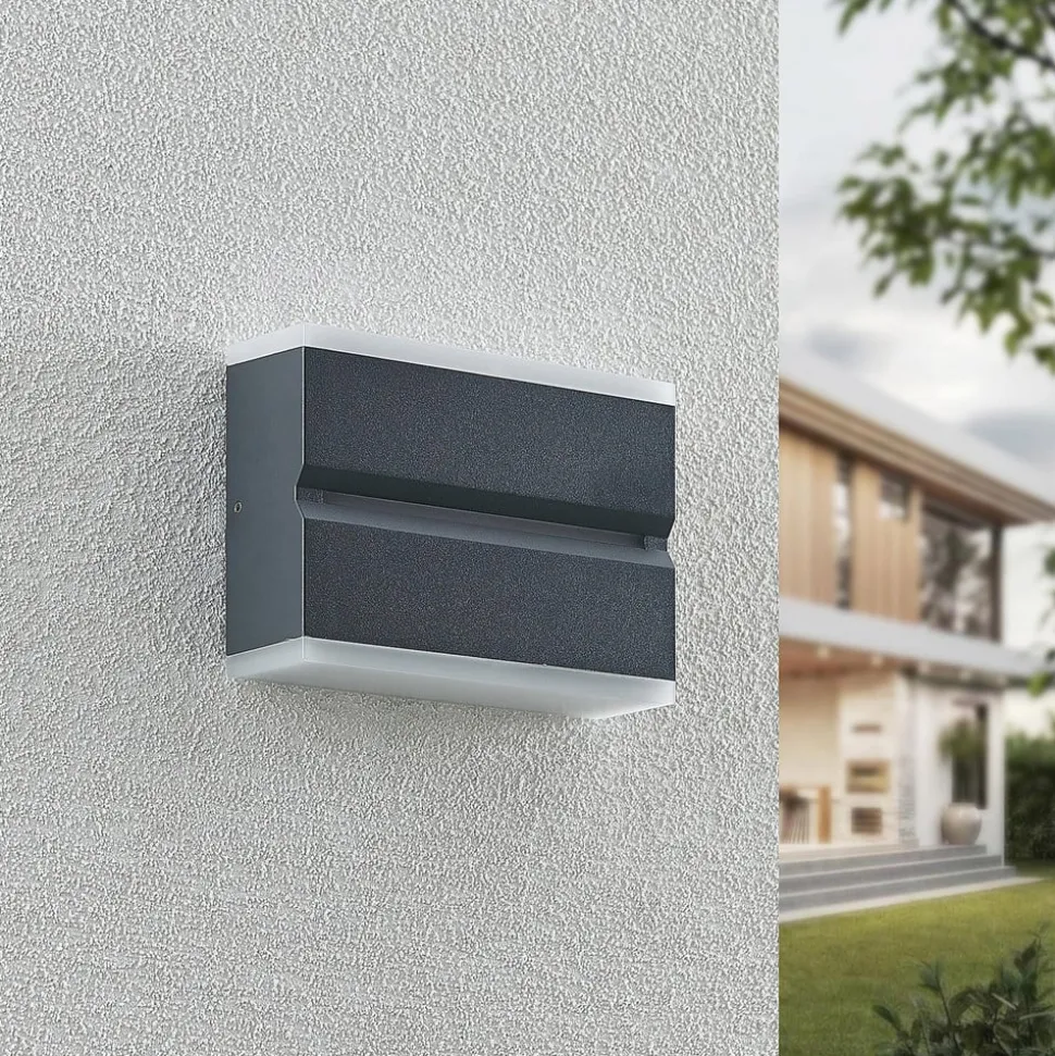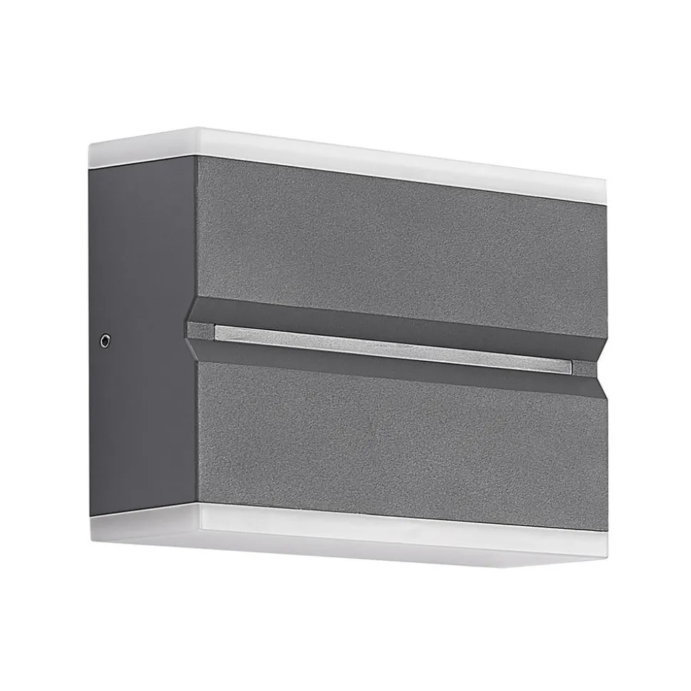 Mørk Itarion LED udendørs-væglampe med opalhvide skærme Itarion LED udendørs-væglampen har et kantet hus af trykstøbt aluminium i en trendy mørkegrå farve. Armaturet har også to skærme af opalhvid polykarbonat, som harmonerer godt med det ellers mørke design. Skærmene fungerer også som diffusorer, så lyset ikke er direkte, men blødere og mere jævnt. De varmhvide LED’er er både lyse og energibesparende, og deres bløde lys skaber en indbydende atmosfære i indgangspartiet.