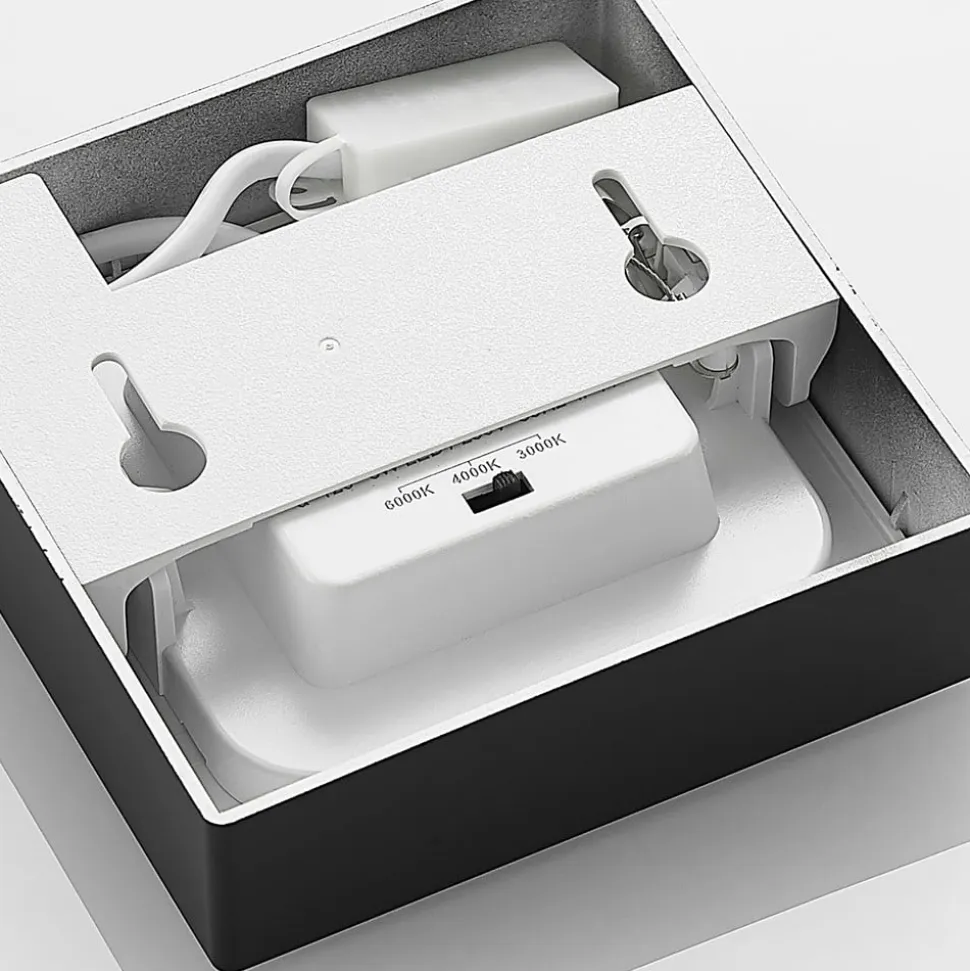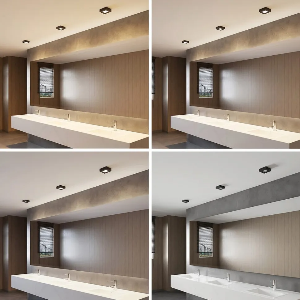 Firkantet Mazin LED-loftslampe med CCT og lysdæmperfunktion, IP44 Mazin LED-loftslampen er fremstillet af aluminium og plast. Det kantede hus er dekoreret med en sort overfladefinish og har et slående og moderne udseende. Designet kan integreres i forskellige indretninger og ser meget stilfuldt ud. Lysstyrken på denne lampe kan justeres individuelt ved hjælp af en ekstern lysdæmper (leading edge phase control). Der er også en DIP-kontakt på huset, som kan bruges til at justere lysfarven på forhånd i flere trin (3.000 K, 4.000 K og 6.000 K). Den har også en IP44-beskyttelsesgrad, hvilket betyder, at lampen også kan bruges i et badeværelse. Den er velegnet til brug i både den private og kommercielle sektor. Tekniske data: – Dæmpbar (leading edge phase control) – CCT-funktion via DIP-switch: 3.000 K / 4.000 K / 6.000 K – IP44-beskyttelsesklasse – 120° strålevinkel