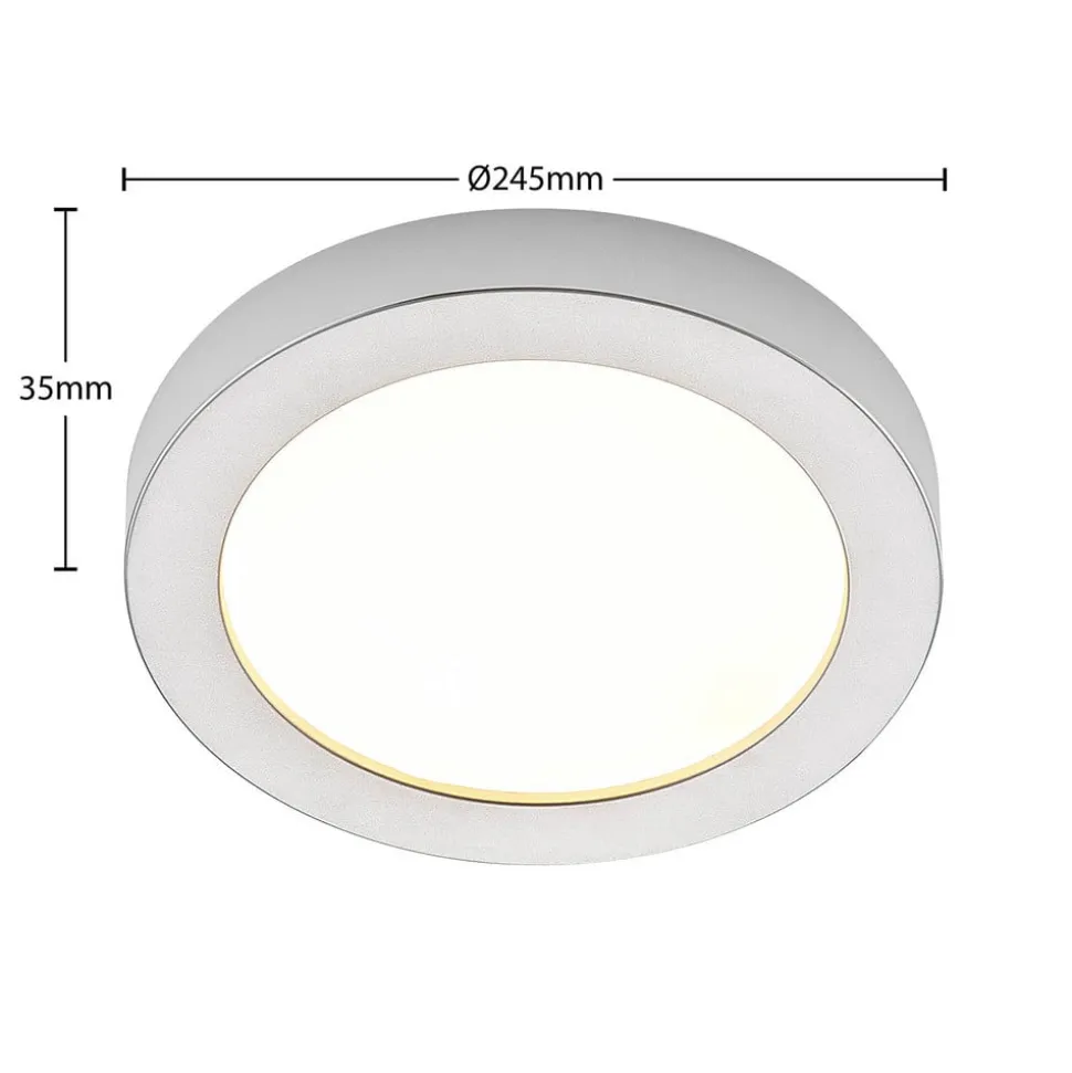 Edwina rund LED-loftlampe med sølvfarvet ramme og kapslingsgrad IP44, forudindstillelig lysfarve – i praktisk sæt med 2 stk. Denne LED-loftlampe med fastmonterede lysdioder er en klassisk allrounder til mange lejligheder. Med en DIP-kontakt på huset kan man vælge en af tre lysfarver før installation – alt efter hvad der passer bedst til stedet og formålet. LED’erne giver stærkt lys med lavt strømforbrug og er derfor særligt effektive. Hvis det er nødvendigt, kan lysintensiteten justeres ved hjælp af en ekstern dæmper. Derudover giver kapslingsgraden IP44 god beskyttelse mod fugt, hvilket betyder, at Edwina også kan bruges til at oplyse fugtige rum. LED-loftlampen kan bruges godt i både kommercielle og private omgivelser, og det runde design med sølvramme fremstår behageligt diskret og alsidigt. – forudindstillelig lysfarve (DIP-kontakt) – kapslingsgrad IP44 til badeværelser og fugtige rum – eksternt dæmpbar – armaturet leveres i et sæt med 2 stk