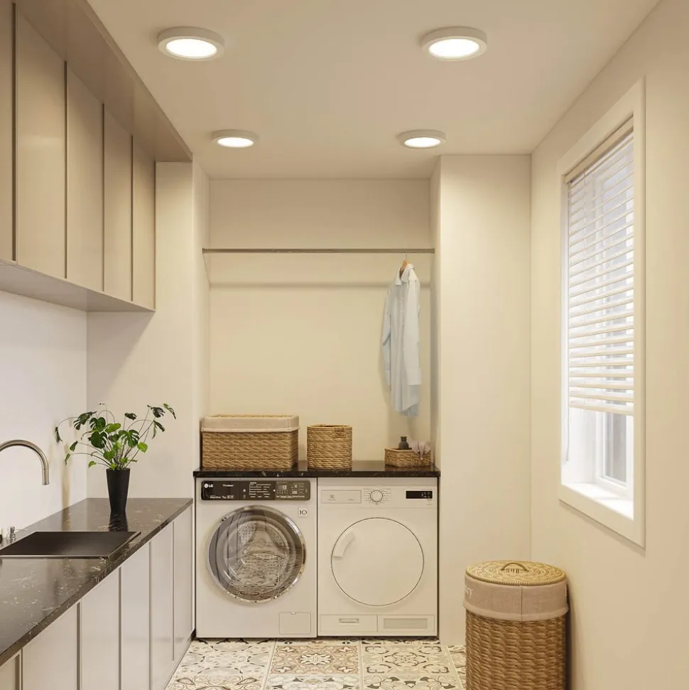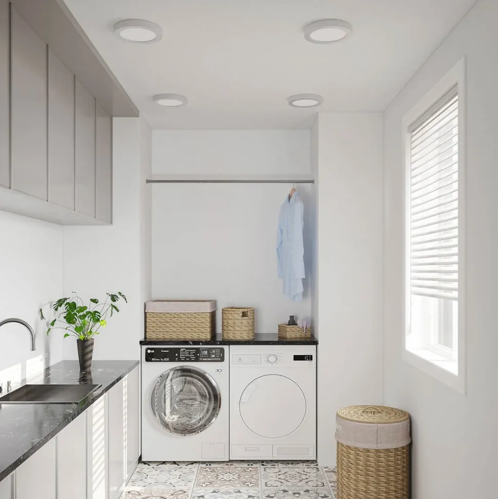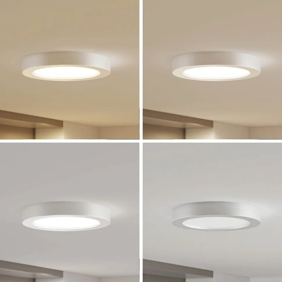 Edwina rund LED-loftlampe med sølvfarvet ramme og kapslingsgrad IP44, forudindstillelig lysfarve – i et praktisk sæt med 3 Denne LED-loftlampe med fastmonterede lysdioder er en klassisk allrounder til mange lejligheder. Med en DIP-kontakt på huset kan man vælge en af tre lysfarver før installation – alt efter hvad der passer bedst til stedet og formålet. LED’erne giver stærkt lys med lavt strømforbrug og er derfor særligt effektive. Hvis det er nødvendigt, kan lysintensiteten justeres ved hjælp af en ekstern dæmper. Derudover giver kapslingsgraden IP44 god beskyttelse mod fugt, hvilket betyder, at Edwina også kan bruges til at oplyse fugtige rum. LED-loftlampen kan bruges godt i både kommercielle og private omgivelser, og det runde design med sølvramme fremstår behageligt diskret og alsidigt. – forudindstillelig lysfarve (DIP-kontakt) – kapslingsgrad IP44 til badeværelser og fugtige rum – eksternt dæmpbar – armaturet leveres i et sæt med 3 stk