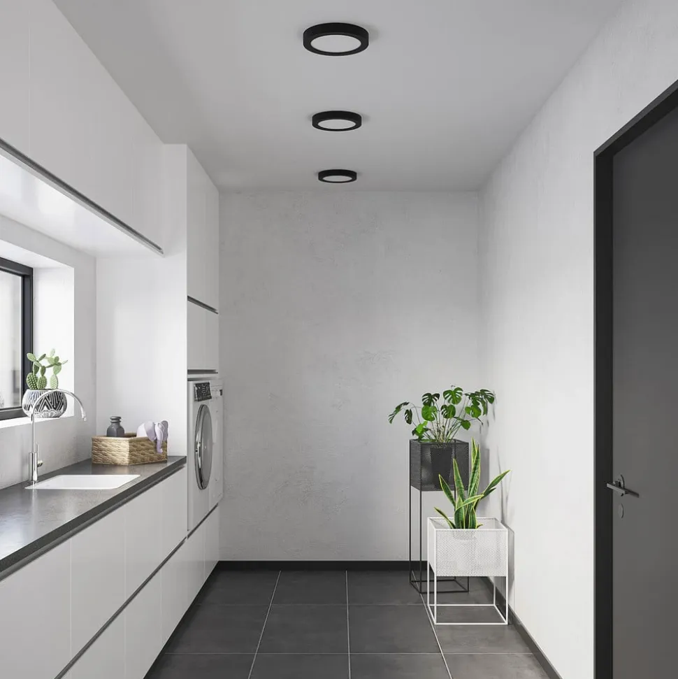 Moderne LED-loftlampe Edwina med mange tekniske funktioner og IP44 LED-loftlampen Edwina har et rundt design, der passer smukt ind i næsten alle miljøer. Lampen er fremstillet af holdbart plast og aluminium. Det runde hus har en klassisk sort finish, mens lampeskærmen giver en smuk kontrast i hvid. Edwinas lysfarve kan varieres i trin (3.000 K, 4.000 K og 6.000 K) ved hjælp af en DIP-kontakt på huset før installation. Lysstyrken kan også justeres, så den passer til individuelle behov, ved hjælp af en ekstern forkantstyret dæmper. Takket være IP44-klassificeringen kan den også installeres i et badeværelse. Dette praktiske armatur kan bruges både i hjemmet og i kommercielle områder. Tekniske data: – Dæmpbar via en ekstern forkantstyret dæmper – CCT-funktion via DIP-kontakt: 3.000 K / 4.000 K / 6.000 K – IP44 kapslingsgrad – 120° udstrålingsvinkel