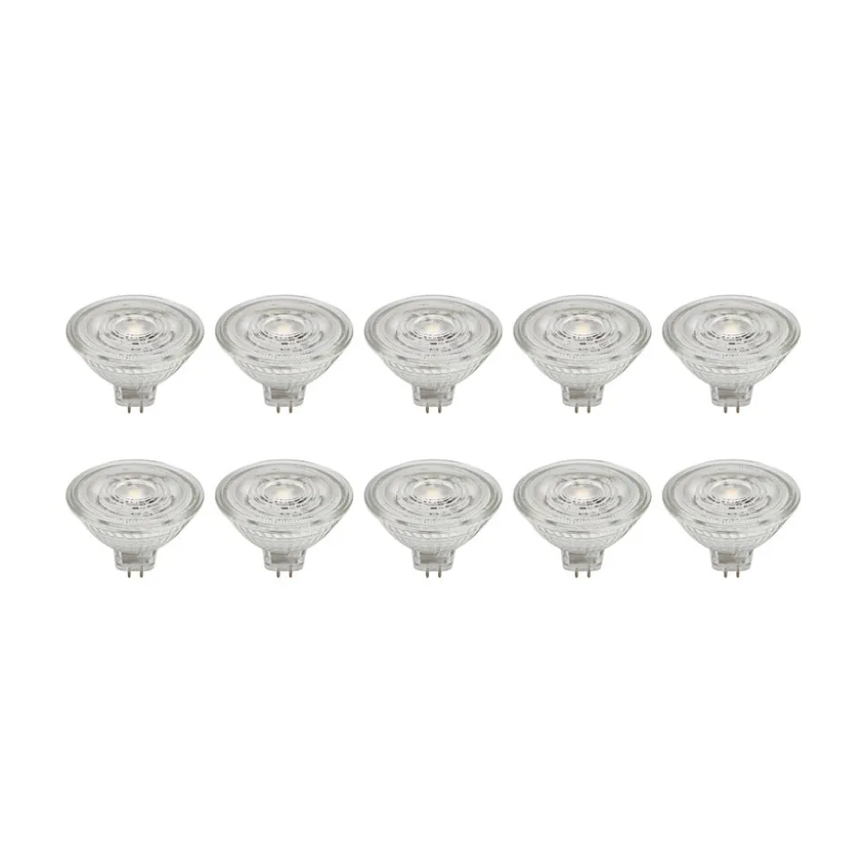 GU5.3 LED-reflektor af glas, transparent i praktisk sæt med 10 stk. Denne LED-reflektor passer til mange lamper med GU5.3-fatning. Den er lavet af glas og kan bruges fleksibelt takket være det gennemsigtige farvedesign – kan ikke dæmpes – 4,3W – 345 lumen – udstrålingsvinkel 36° – leveres i et sæt med 10 stk