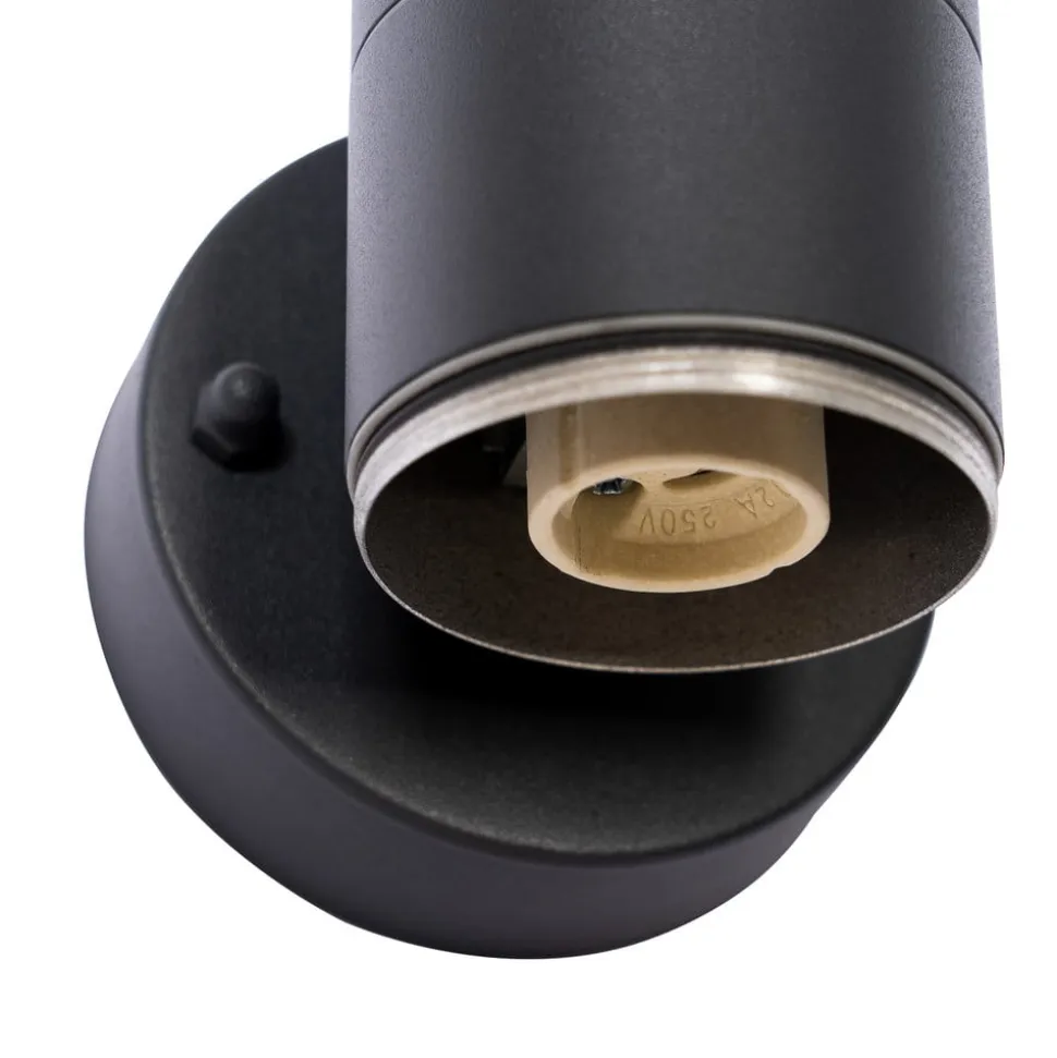 Moderne Tulimar udendørs væglampe med dobbelt stråleretning Tulimar udendørs væglampen kommer i en version med 2 lyskilder og imponerer med det samme med sit afrundede design. Den cylindriske lampeskærm af mørkegrå aluminium huser to lyspunkter, der sender lys opad og nedad langs væggen. Det skaber elegante lysaccenter på husmuren, og beskueren bliver ikke blændet – ideelt til brug ved husets indgang eller på terrassen. Den trendy mørkegrå farve harmonerer rigtig godt med moderne omgivelser.
