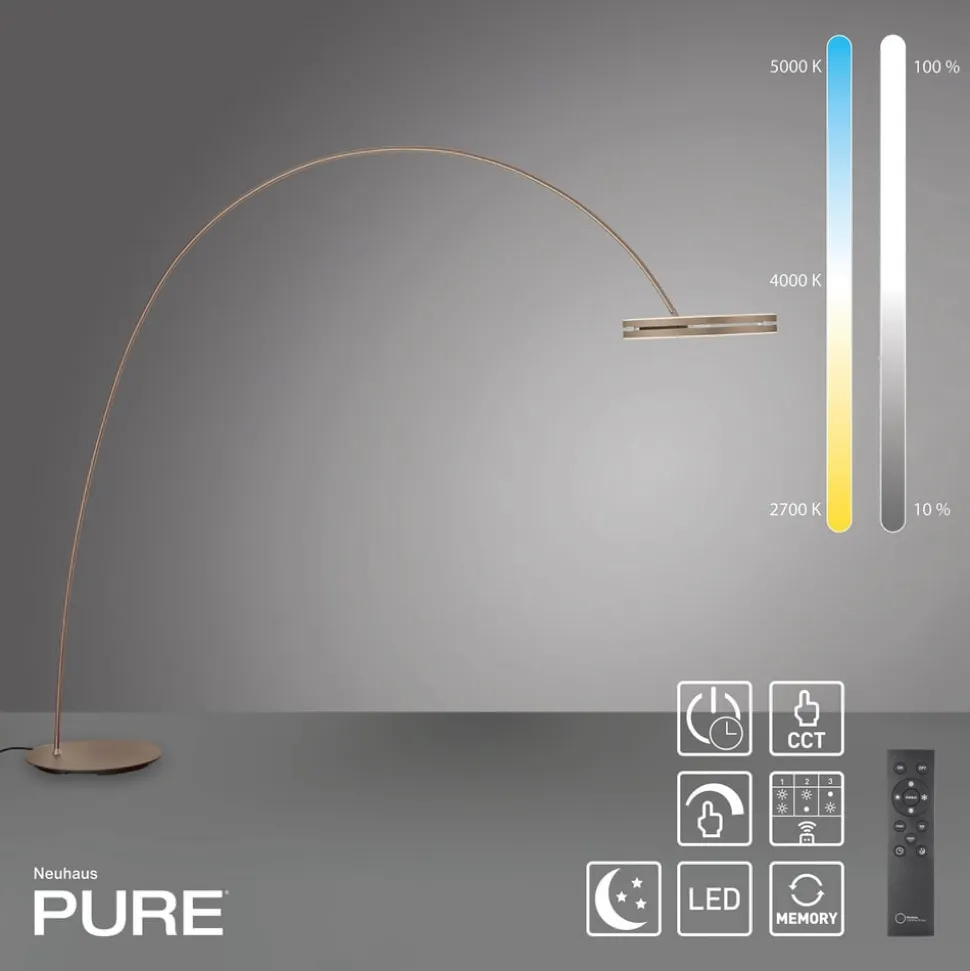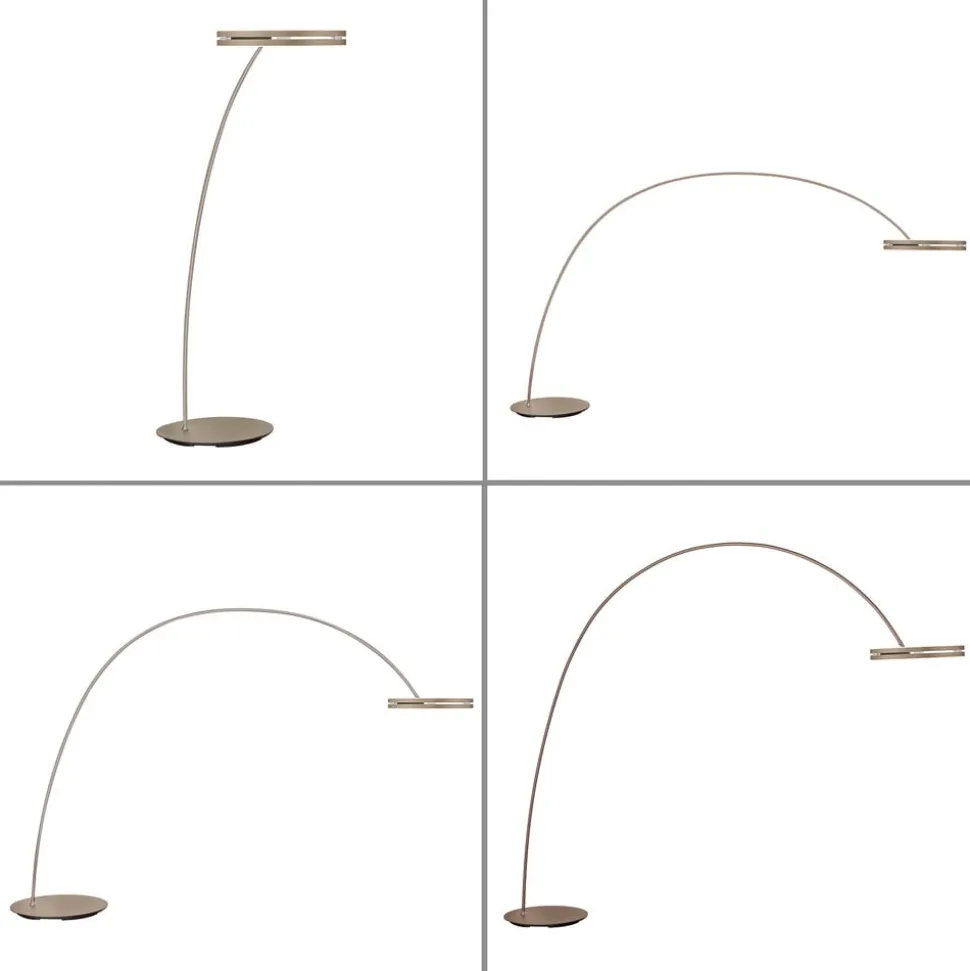 LED-bue- eller gulvlampen Loop-Bow kombinerer ekstraordinært design med gennemtænkt funktionalitet og den nyeste belysningsteknologi. Med sin elegante, buede form bliver den et markant blikfang i bolig- eller arbejdsområder – uanset om den bruges som rumfyldende bue- eller klassisk gulvlampe. Lampen er udstyret med to kraftige LED-kort og tilbyder både opadrettet og downlight, som kan styres separat via integrerede berøringsflader. CCT-farvetemperaturstyringen gør det muligt at justere lysfarven trinløst via en trådløs fjernbetjening eller direkte via touch-dimmeren på lampen. Lysstyrken kan også reguleres trinløst. Takket være hukommelsesfunktionen gemmes alle tidligere valgte indstillinger og hentes direkte, når lampen tændes igen. Den integrerede timer- og natlysfunktion giver ikke kun ekstra komfort, men muliggør også automatisk lysstyring og blødt, blændfrit lys om aftenen – ideelt til afslappede nætter eller som orienteringshjælp i mørket. Et særligt kendetegn ved lampen er, at den både kan bruges som buelampe og gulvlampe. Før montering kan lampen indstilles i tre forskellige højder.