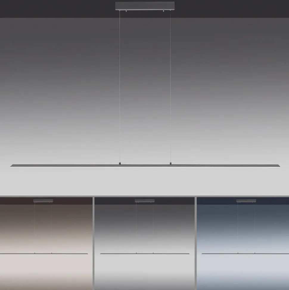 Lang Pure-Lite hængelampe med sensorkontakter, CCT-funktion, dæmpbar Den lange Pure-Lite hængelampe er fremstillet af aluminium og har en antracit farve. LED’erne i den lange, smalle lampeskærm er placeret bag et PMMA-dæksel og spotlighter derfor blændfrit, hvilket kan justeres variabelt takket være to sensorkontakter, der er integreret i toppen af lampeskærmen. Armaturets lysfarve kan vælges i tre trin fra varmhvid til universalhvid, og lyset kan også dæmmes trinløst. Den ene sensor kan bruges til at tænde og slukke armaturet med en kort strygebevægelse, mens den anden sensor ændrer lysfarven med en strygebevægelse og starter dæmpningsprocessen, når hånden holdes over sensoren, som afsluttes, når den ønskede lysstyrke er nået ved at fjerne hånden. Armaturet er udstyret med en hukommelsesfunktion, så den valgte lysindstilling gemmes og lyser op igen, næste gang det tændes.