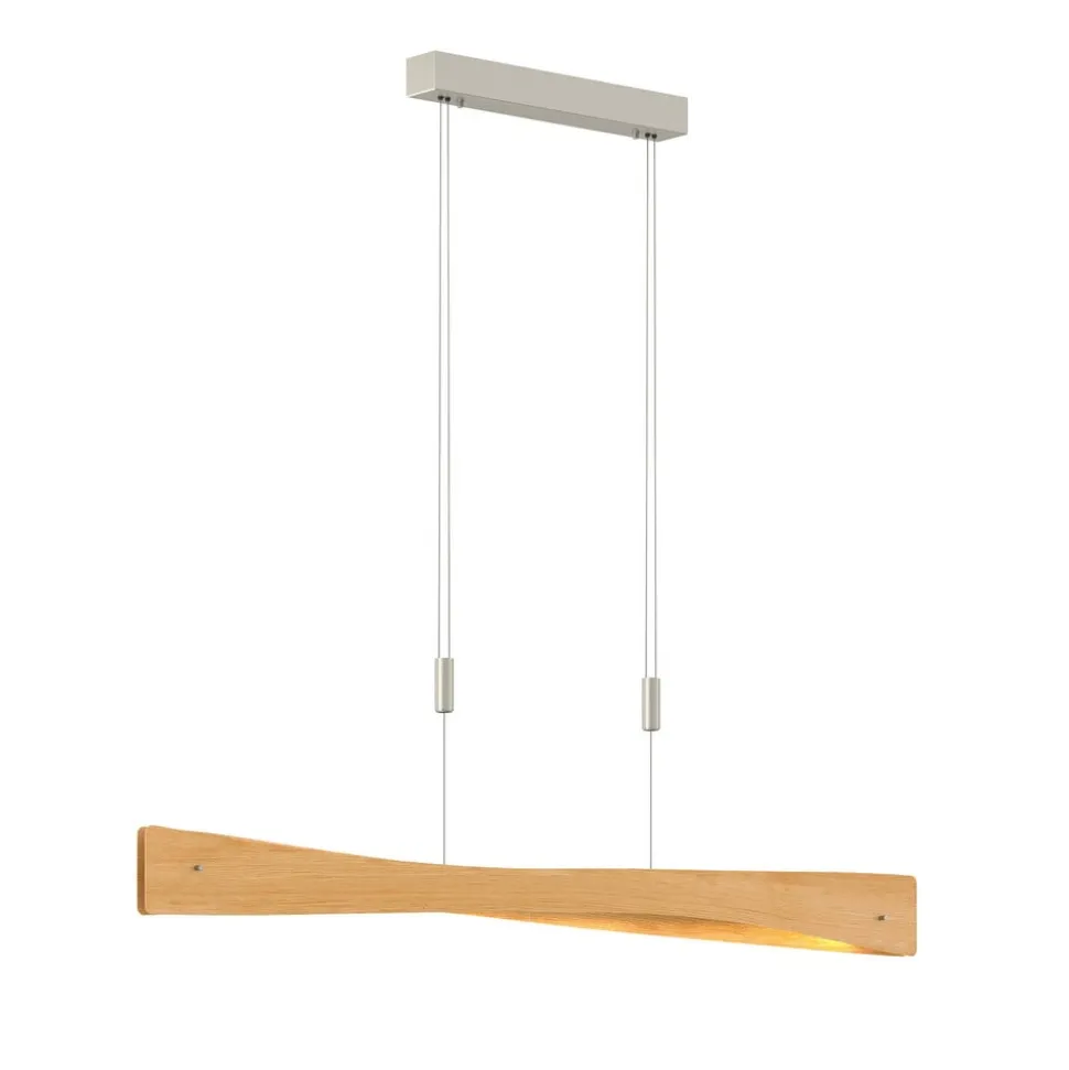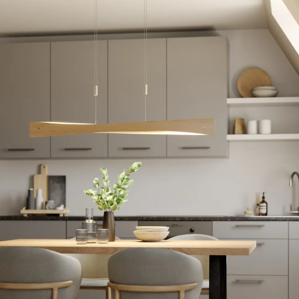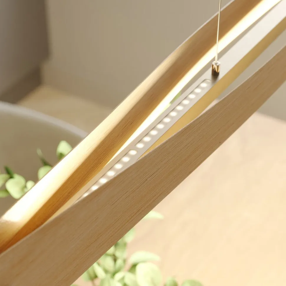 Højdejusterbar LED-pendel Lian med aflang skærm af lyst egetræ, bedste kvalitet fra Tyskland Lian giver stuen eller spisestuen et naturligt præg, fordi den aflange lampeskærm er lavet af lyst egetræsfiner og består af to buede paneler, der vender mod hinanden, og som lader lyset strømme opad og nedad og giver både direkte og indirekte lys, som tilsammen sikrer en behagelig belysning hele vejen rundt. Lyset fra LED’erne er skarpt og lige så varmt hvidt som fra klassiske glødelamper, så du får en lyskilde med et hyggeligt helhedsindtryk i dit hjem, og det er kendetegnet ved en meget god effektivitet, som giver en kombination af masser af lys og lavt strømforbrug. Om nødvendigt kan du bruge en eksternt installeret lysdæmper (fase tændt eller fase slukket) til at justere lysstyrken efter behov og variere højden fra 105 cm til 195 cm. Egetræsoverfladen er blevet fremragende færdiggjort i hånden, og lyset til opholds- og spiseområdet er et kvalitetsprodukt fremstillet i Tyskland med et udseende af meget høj kvalitet og umiskendelig charme. Takket være den førsteklasses farvegengivelse (CRI > 90) kan farvetoner vises så uforfalskede som muligt, og tilslutningsrummet i loftboksen er ret stort, så ingen komponenter bliver tilovers under installationen, og alt det nødvendige kan nemt gemmes væk.
