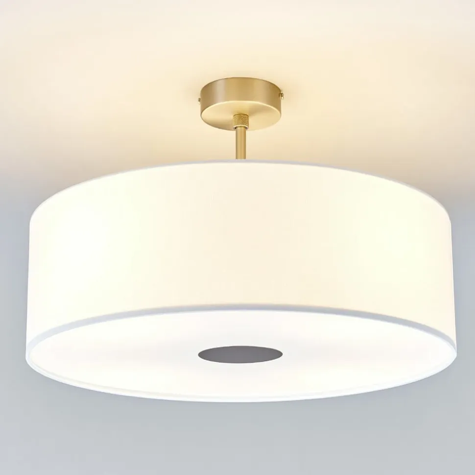 Flammehæmmende Gala LED-loftslampe med hvid chintz-skærm Vi forbinder farven hvid med renhed, elegance og lys. Armaturer i denne farve virker derfor umiddelbart lyse og rene. Gala LED-loftslampen skaber netop denne effekt, når dens varmhvide lys tændes. Det chintz-stof af høj kvalitet, som armaturets skærm er lavet af, imponerer med sin homogene lysfordeling og sin ensartede struktur. Det faktum, at Gala-skærmen ikke er placeret direkte på loftet, men lidt under det takket være et afstandsstykke, har også en positiv effekt på lyseffekten. Lyset kan spredes uhindret, ikke kun gennem den gennemsigtige chintz-afskærmning, men også som en indirekte glød mod loftet. En absolut sjældenhed i forbindelse med stofarmaturer er, at de er svære at antænde. Gala LED-loftslampen opfylder denne egenskab. Bærefilmen, som skærmen er belagt med, er svær at antænde og opfylder derfor kravene til byggematerialeklasse B1. LED-lyskilderne, der leveres med E27-fatning, giver en høj energieffektivitet. Men den, der foretrækker konventionelle lyskilder som gløde- eller sparepærer, kan nemt udskifte LED-lamperne med den ønskede type lyskilde.