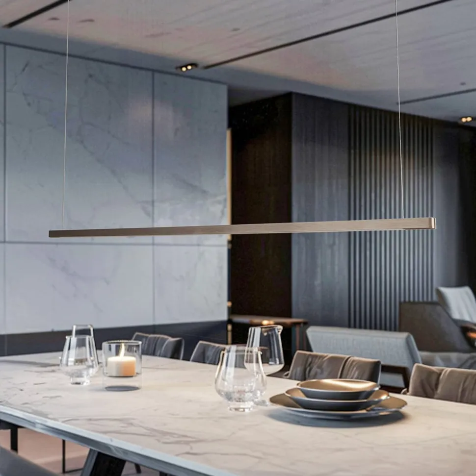 Lang Talon LED-hængelampe i aluminium med CCT og dæmpningsfunktion Med sin lange og ekstremt smalle form er Talon LED-hængelampen ideel til belysning af lange stue-, spisestue- eller køkkenborde. Takket være det diskrete farvedesign i lys bronze passer den nemt ind i forskellige boligområder og indretningsstile. Talon er fremstillet af aluminium, messing og akryl. Den anodiserede overflade er omhyggeligt udformet i hånden. Den har en særlig beskyttende belægning, der forhindrer den naturlige oxidering af metallet. Pendellampen er derfor meget robust og holdbar. Talon er praktisk udstyret med en bevægelseskontrol, der gør det muligt at regulere lysstyrken. Farvetemperaturen kan også justeres trinløst fra varmhvid til universalhvid. Lysets højde er også variabel. Det betyder, at man på ingen tid kan skabe de rette lysforhold til enhver situation.