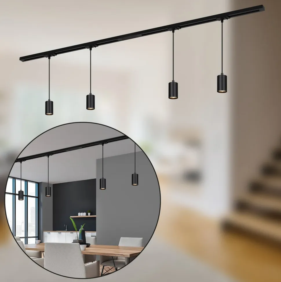 4 lyskilder skinnesystem med fire pendellamper Sættet med 230V skinnesystem består af: – 4 pendellamper med GU10 fatning – 2 skinner – 2 endestykker – 1 fremfører – 2 lige forbindelser