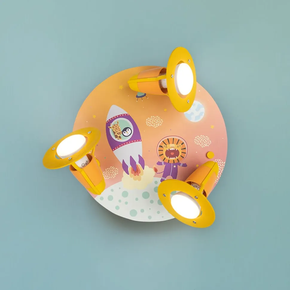 Loftslampe til børneværelset Escape med tre bevægelige spots Den fantasifuldt designede loftslampe Escape har et loftspanel i træ med et flot børnevenligt motiv. Giraffen og pingvinen sidder i raketten, og den modige løve går rundt på en planet i sin rumdragt. Hvem vil ikke gerne være med på turen og opleve store eventyr? Selve loftslampen er udstyret med tre bevægelige spotlights, som oplyser hvert hjørne af rummet og dermed giver tilstrækkelig grundbelysning på børneværelset.