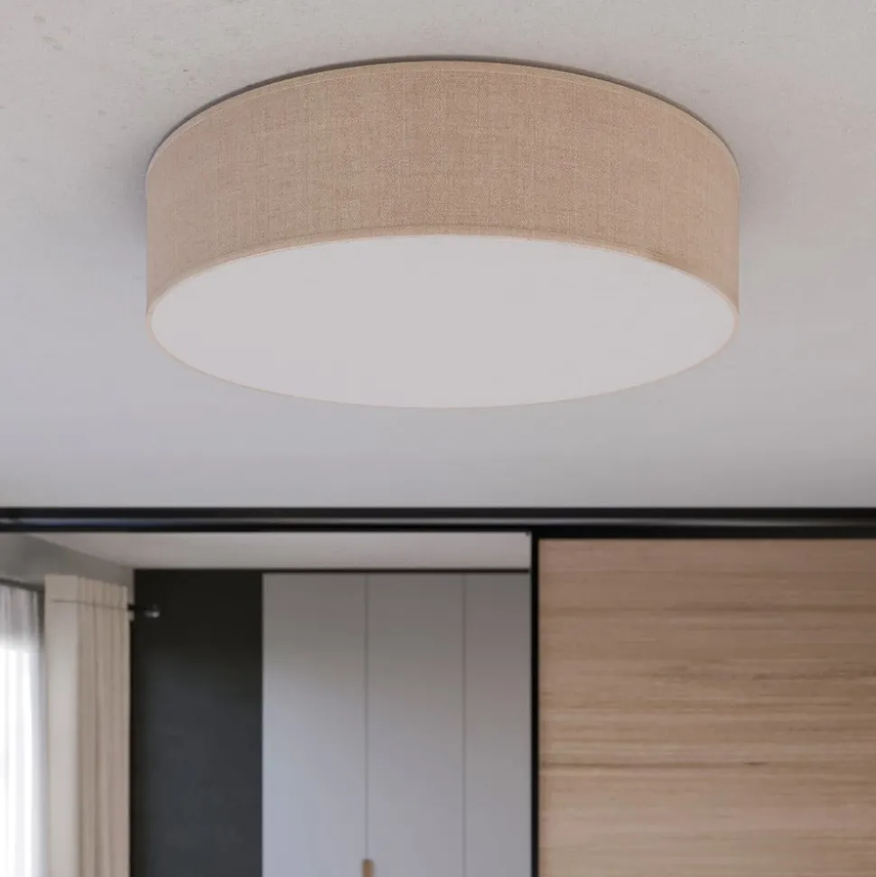 Loftlampen Rondo i beige tekstil forener tidløst design med funktionel belysning. Den elegante tekstilskærm sikrer en jævn og blød lysfordeling, der giver ethvert rum en varm og indbydende atmosfære. Den diskrete beige farve passer perfekt ind i forskellige indretningsstilarter og er en alsidig løsning til belysning af stuer og soveværelser.
