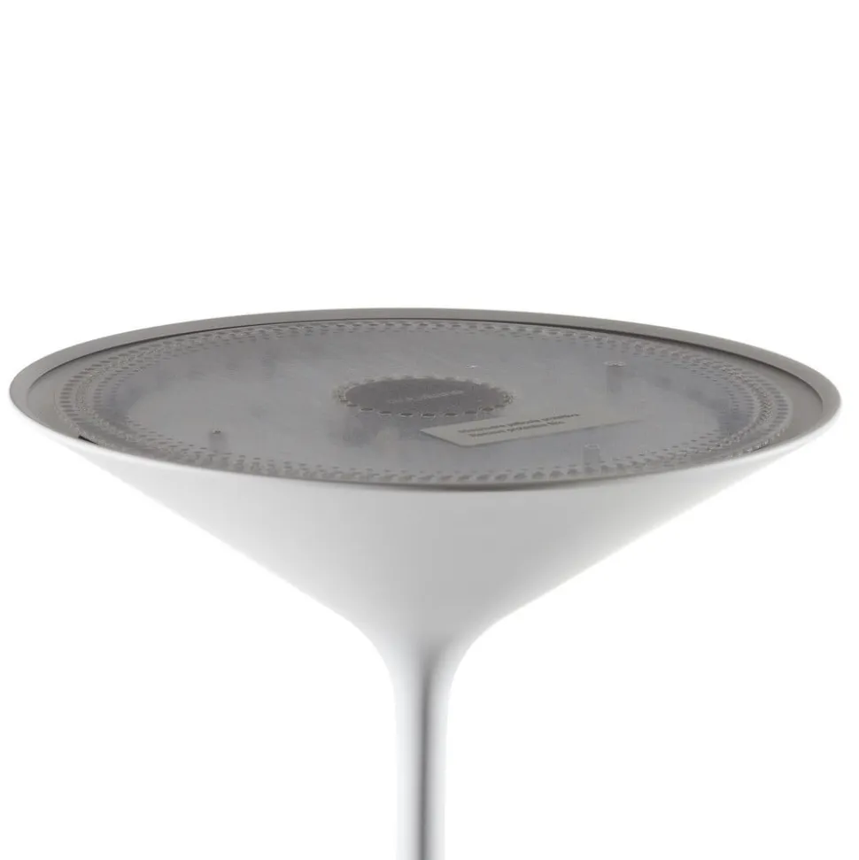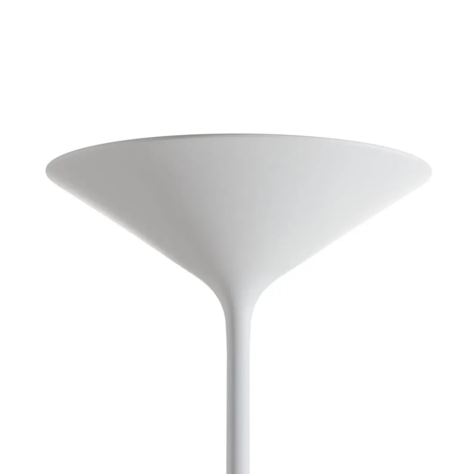 Designerne Giovanni Lauda og Dante Donegani blev inspireret af et cocktailglas til designet af gulvlampen Dry. Ud fra den skiveformede fod rager en lang, rund stang i stil med glasset, der går ubesværet over i den tragtformede skærm, som åbner opad.