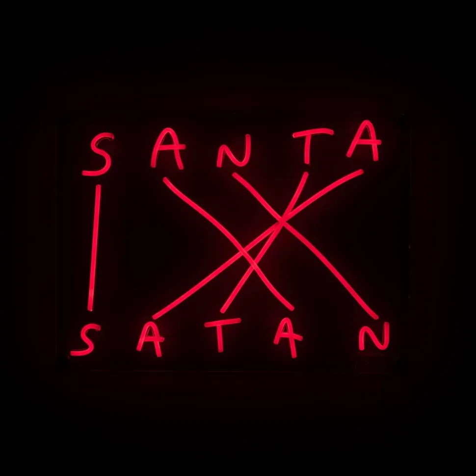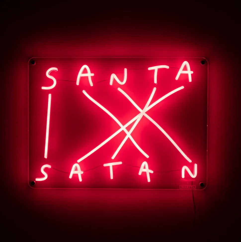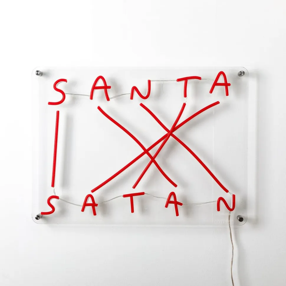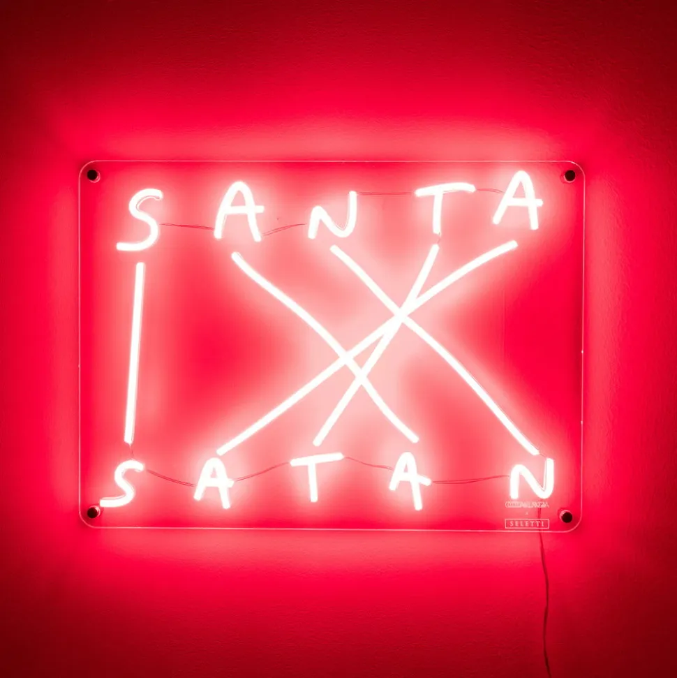 LED dekorativ væglampe med anagram “Santa-Satan”, røde LED-lysstrimlerEt strålende eksempel på brugen af de stilistiske anagrammer og antonymer er repræsenteret af denne LED-væglampe. “Santa-Satan” er udstyret med røde LED-silikone-rør, der repræsenterer de førnævnte udtryk, som er modsætninger, men som alligevel er dannet af identiske bogstaver. LED-strimlerne er fastgjort af en klar akrylplade. LED-væglampen er designet i stil med farverig neonbelysning og er ideel til dekorativ interiørbelysning – Udstyret med stikkabel og lysdæmper – Design by Nico Vascellari, Codalunga & Seletti