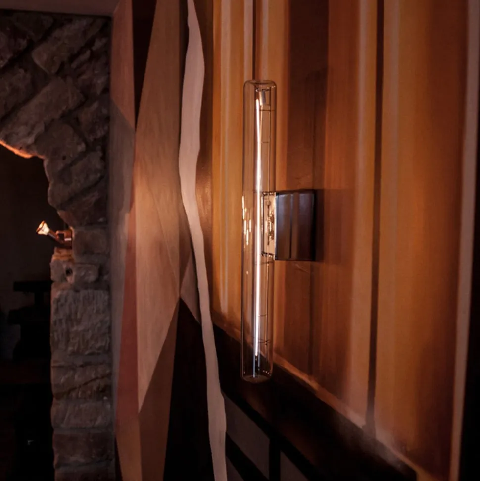 Den sorte vægbeslag lavet af metal er minimalistisk og reduceret til det væsentlige. Det er rektangulært og er simpelthen fastgjort til væggen. Størstedelen af denne væglampe er en S14d- fatning. Den anvendte lyskilde kommer til sin ret takket være den enkle holder, fordi intet vil distrahere fra lyseffekten og den elegante lineære lampe.
