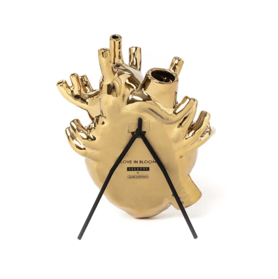 Plantekrukke og skulptur i ét: Guldfarvet Love in Bloom-vase af højkvalitetsporcelæn fra SELETTI Love in Bloom er en hjerteformet vase, der ser ud, som om den kom ud af et essay om menneskets anatomi. En moderne kærlighed omsat til en romantisk, men uforudsigelig gave. Det er ikke en drøm, det er kærlighed i blomst. Det er ikke forår, det er kærlighed i blomst. Inklusive stativ og gaveæske.