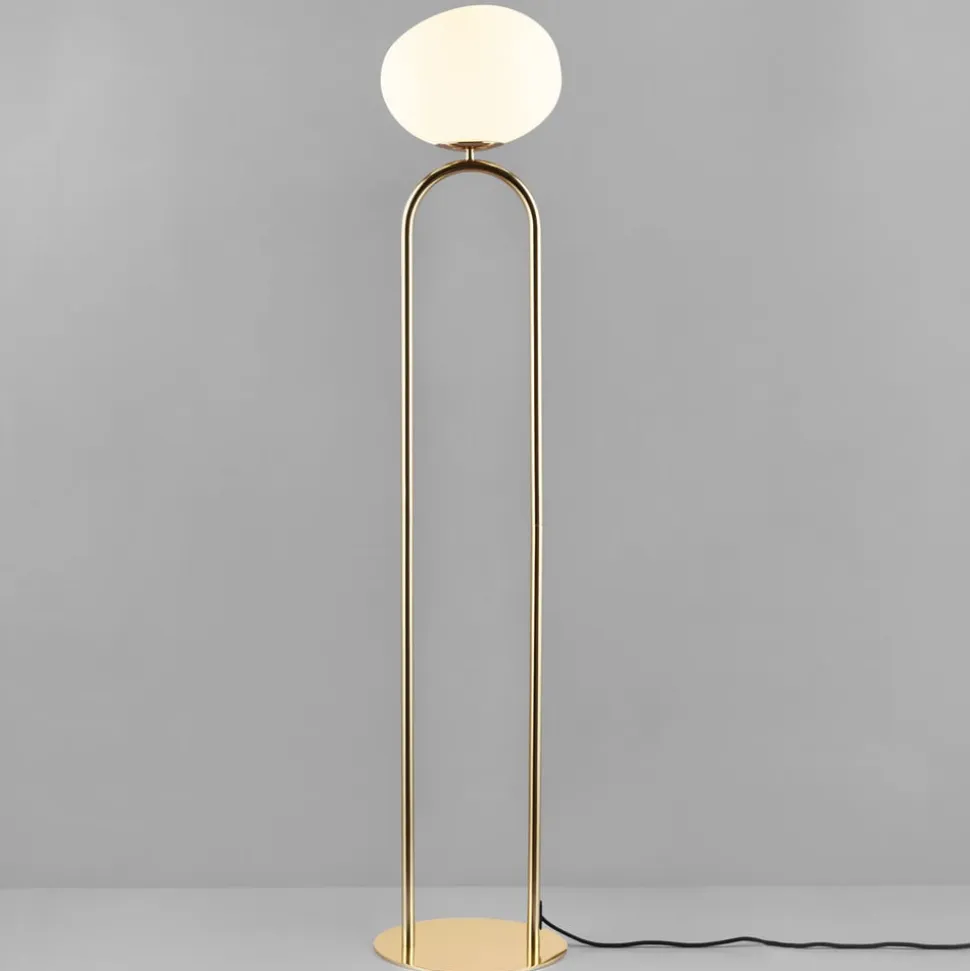 Elegant gulvlampe Shapes i glas og messingDen danske designer Maria Berntsens Shapes-serie er inspireret af elegante, organisk formede smykker. Den opale glasskærm med sin unikke, asymmetriske form spiller smukt sammen med den skinnende messingfod og giver et raffineret udtryk. Den mundblæste skærm skaber et diffust lys, der blidt oplyser rummet og indbyder til afslapning.