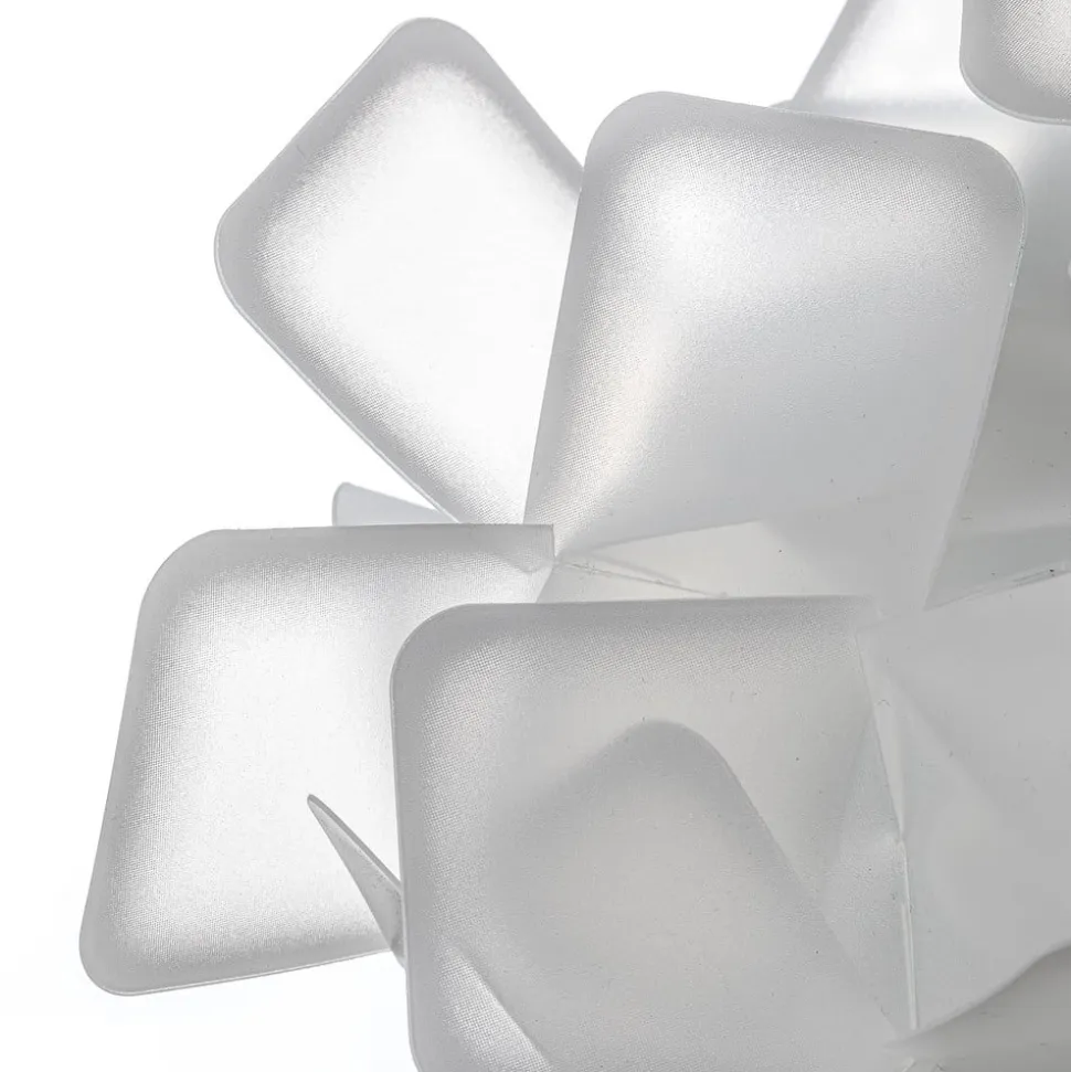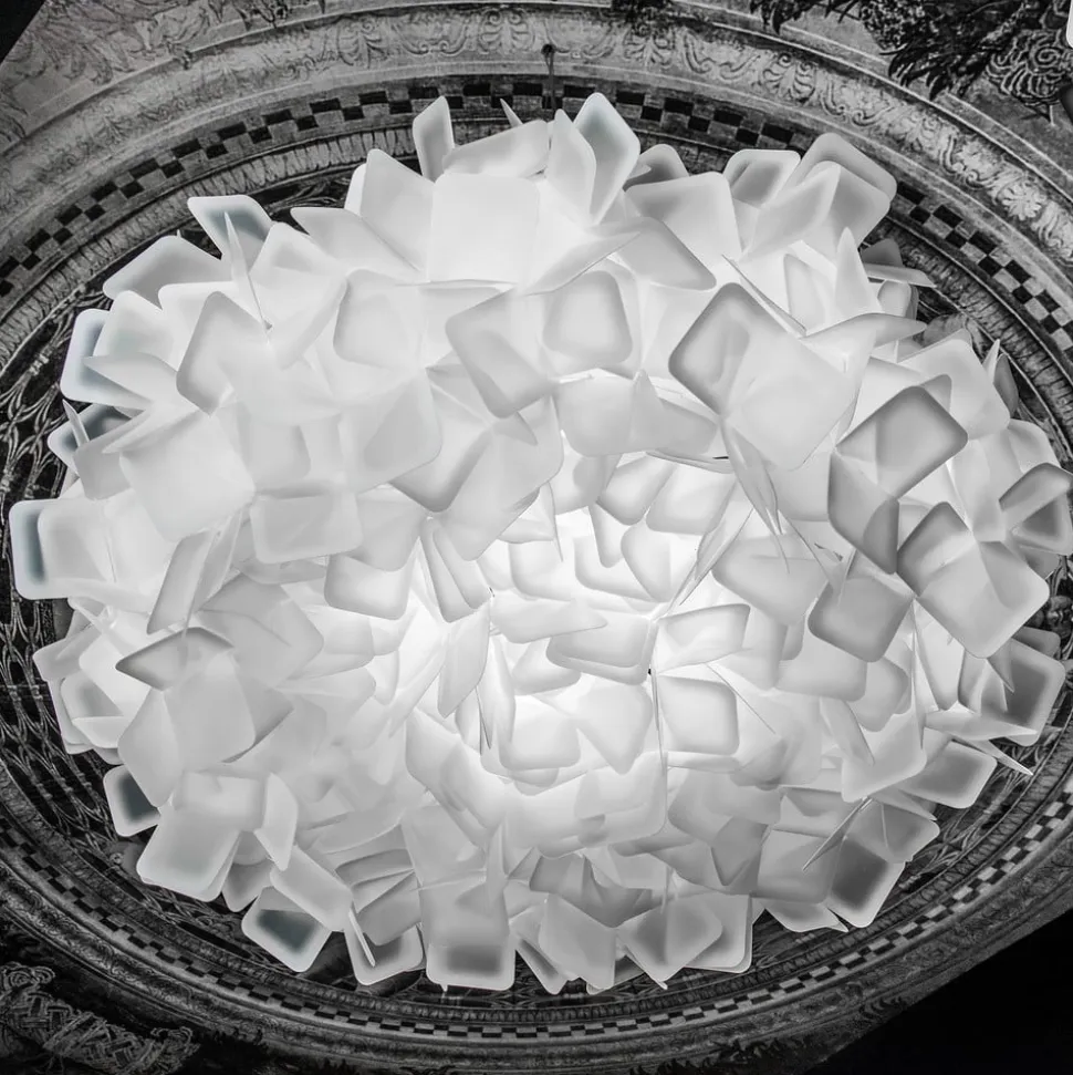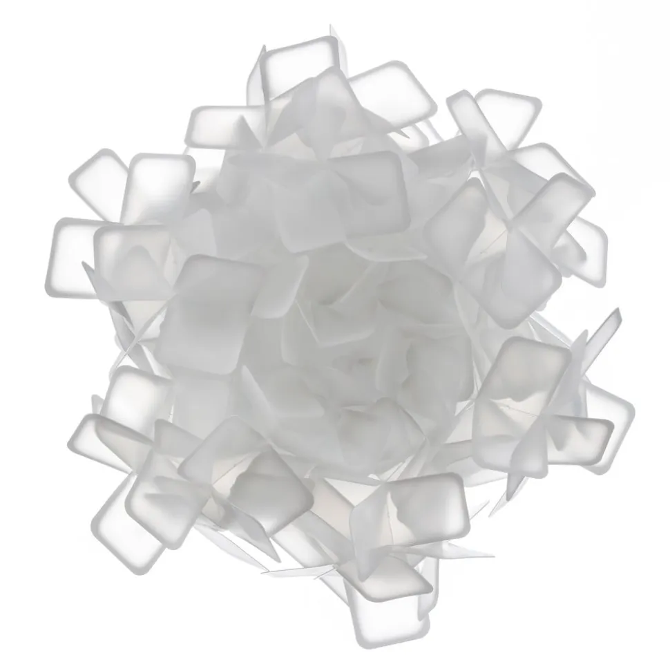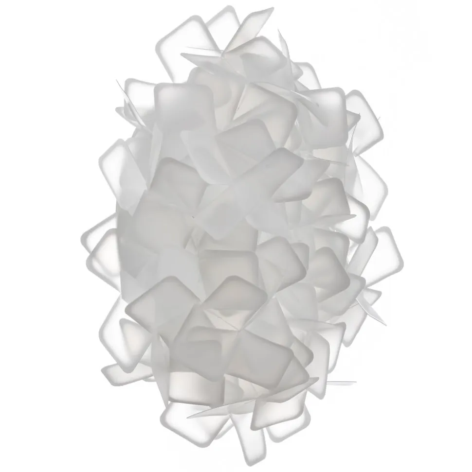Mange små kvadrater er her sammensat af en enkelt større enhed og derved opstår der en helt ny form: I dette tilfælde er den kugleformede lampeskærm på væglampen Clizia. Opalflex®-materialet, som kvadraterne er skabt af, består af en kombination af førsteklasses kunststof og glaskrystal. Det kan genbruges samtidig med, at det har en fascinerende lysskraft, der kan sammenlignes med krystal. Med til Opalflex®-fordelene hører også, at det ikke går i stykker og, at det er meget fleksibelt at bearbejde. I væglampen Clizias tilfælde er kanterne på kvadratet af Opalflex® farvet ved brug af silketrykteknik. Når lampen tændes opstår der således et smukt lys- og farvespil.