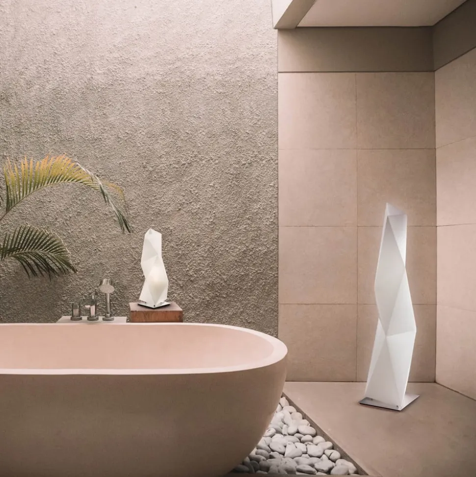 Gulvlampen Diamond, som er udarbejdet af designerne Ines Paolucci og Daniele Statera er en lampe med moderne elegance og et repræsentativt lysobjekt. Basen af aluminium suppleres af en skærm af Opalflex®. Dette alsidige materiale med lang levetid og et kantet design skaber et usædvanlig brydning af lyset når lampen tændes og skaber således et blødt lysskær.