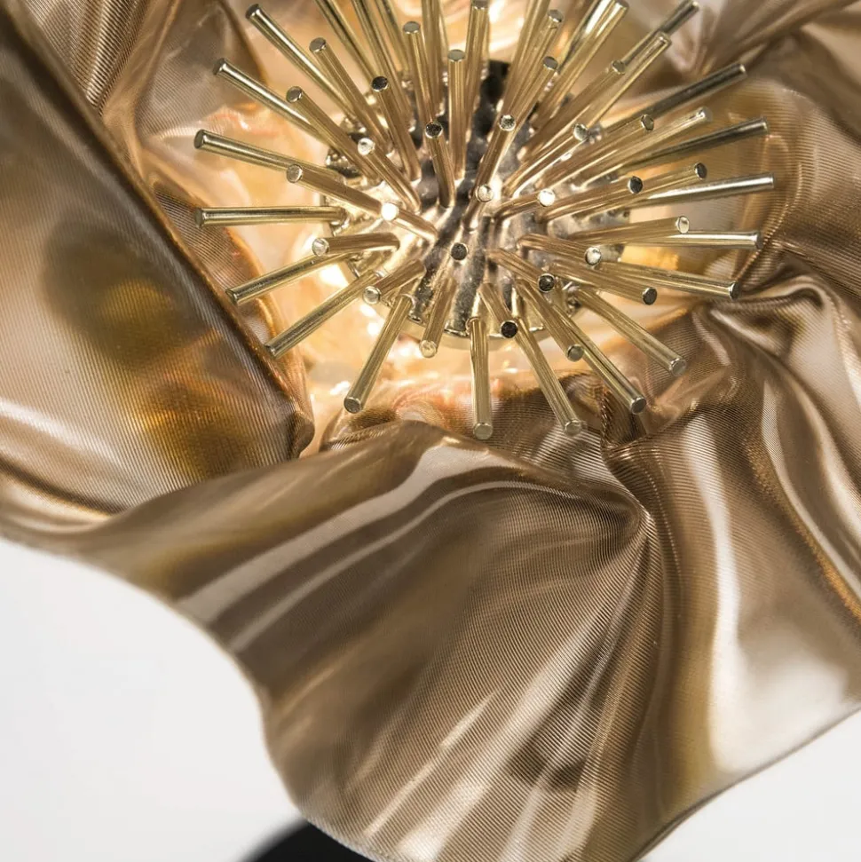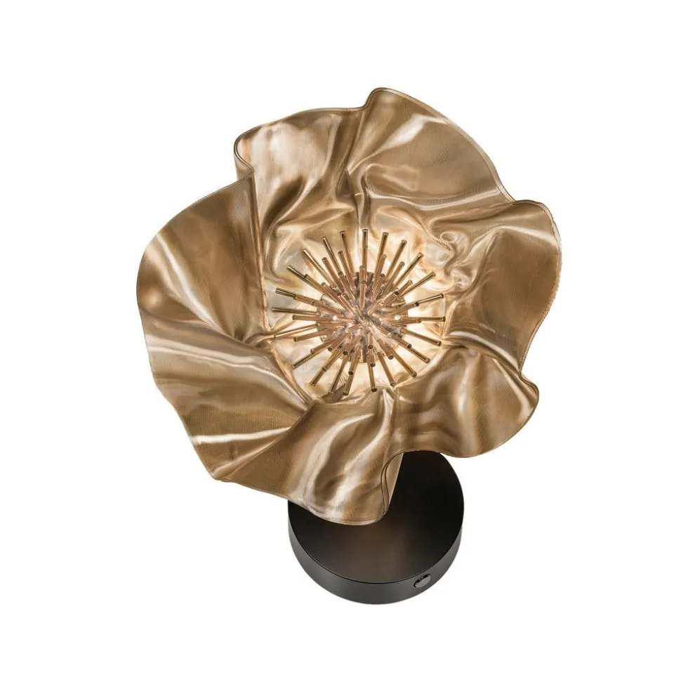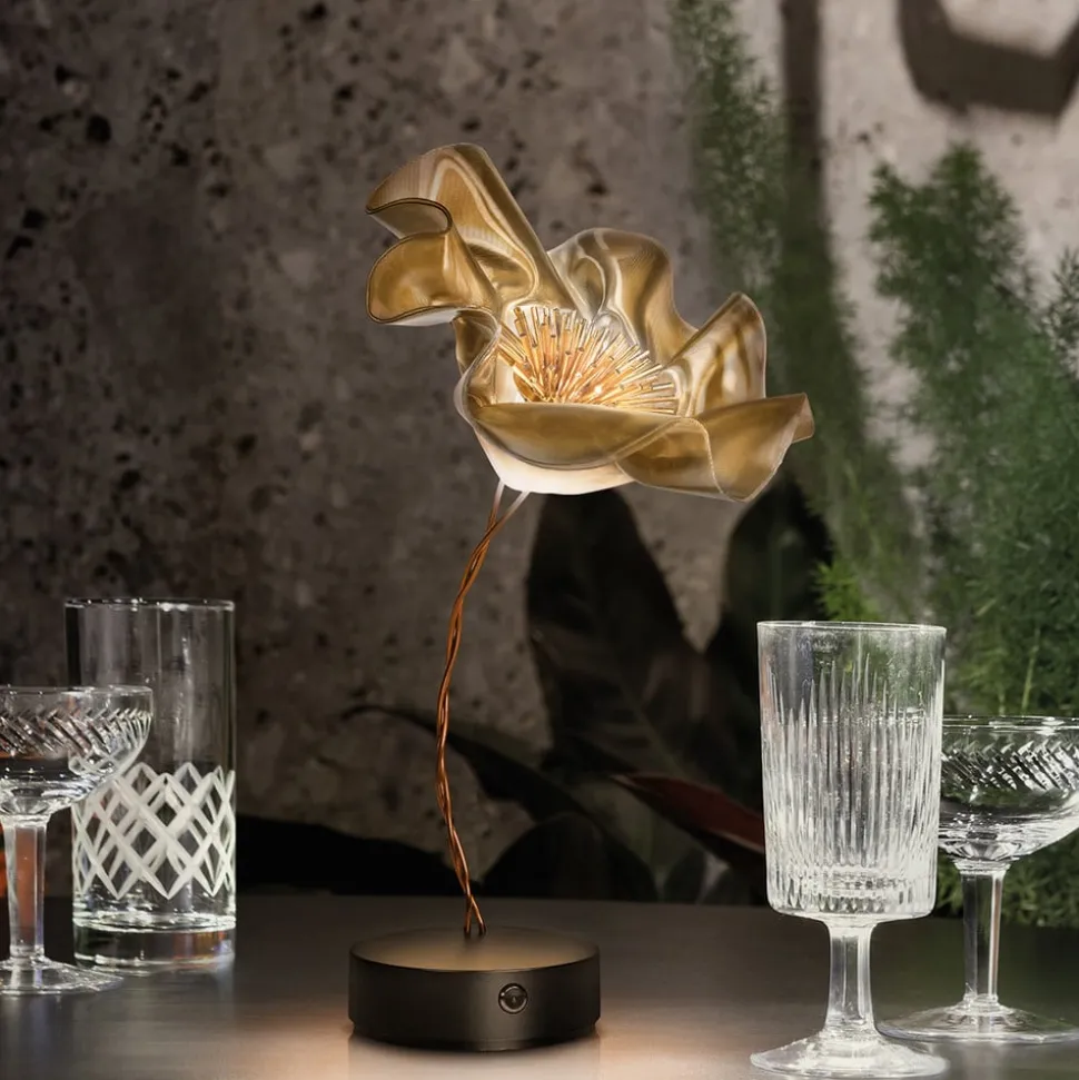 LaFleur – den ekstraordinære LED-bordlampe i form af en gylden blomst Som navnet antyder, er dette kunstværk modelleret efter en blomst. Blomsten er støbt i hånden, hvilket gør den lige så unik som enhver naturlig plante. Lentiflex®-materialet af høj kvalitet er udviklet af den italienske producent Slamp selv og imponerer med sin robusthed, elegance og kvalitet. Det skinner i en gylden farve og giver lyset en særlig varme. Skærmen er modelleret som et bæger og er åben i toppen. Blomsterne danner et dristigt hoved og omgiver de diskrete, stavformede pistiller i midten. Den smukke blomst støttes af en robust, fleksibel, flettet kobbertråd, der skinner i en mørkerød farve og er fastgjort til en matsort base. Der medfølger en magnetisk skive, som f.eks. kan placeres under en dug for at give bordlampen en stabil base, men den kan også monteres på væggen, hvilket demonstrerer denne lampes fleksibilitet. Der er indbygget et genopladeligt batteri i LaFleur bordlampen, som har en driftstid på 6,5 timer og kan oplades via en integreret USB-port. Der er også indbygget en berøringsdæmper i foden, som kan bruges til at justere lysstyrken efter ønske – batterilevetid 6,5 timer ved maksimal effekt – 60 timer ved minimal intensitet – opladningstid 5 timer – trinløs dæmpbar via berøringsdæmper Den italienske producent Slamp står for høj kvalitet og et selvstændigt og kreativt design, der altid er kendetegnet ved det unikke. Siden 1994 har anerkendte designere og arkitekter udtænkt, skåret og formet dekorative designerlamper, hvoraf nogle er fremstillet af patenterede materialer.