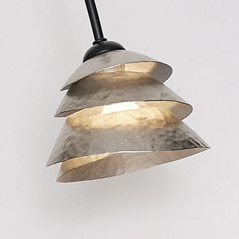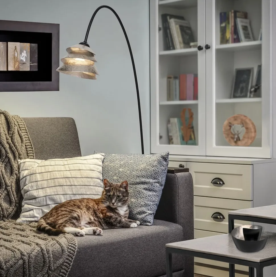 SNAIL ONE gulvlampe – en drøm af jernMed SNAIL ONE gulvlampe, der er fremstillet udelukkende af jern, kan der skabes en hyggelig atmosfære selv i små rum takket være dens smalle dimensioner. Den slanke, sorte lampefod med sølvfarvet dekoration danner en bue i den øverste tredjedel til den brune skærm, som også er lavet af jern. Skærmen består af et spiralformet jernbånd, der er lagt oven på hinanden. Lyset strømmer ud gennem de forskellige åbninger. Et særligt kvalitetstræk ved denne lampe er de filigranagtige sømme i de enkelte bladsølvplader på skærmens overflade, som kun findes i ægte bladsølvarbejde. Sømmene er på ingen måde ridser, men beviser – tværtimod – den høje kvalitet af bladsølvet i denne gulvlampe.