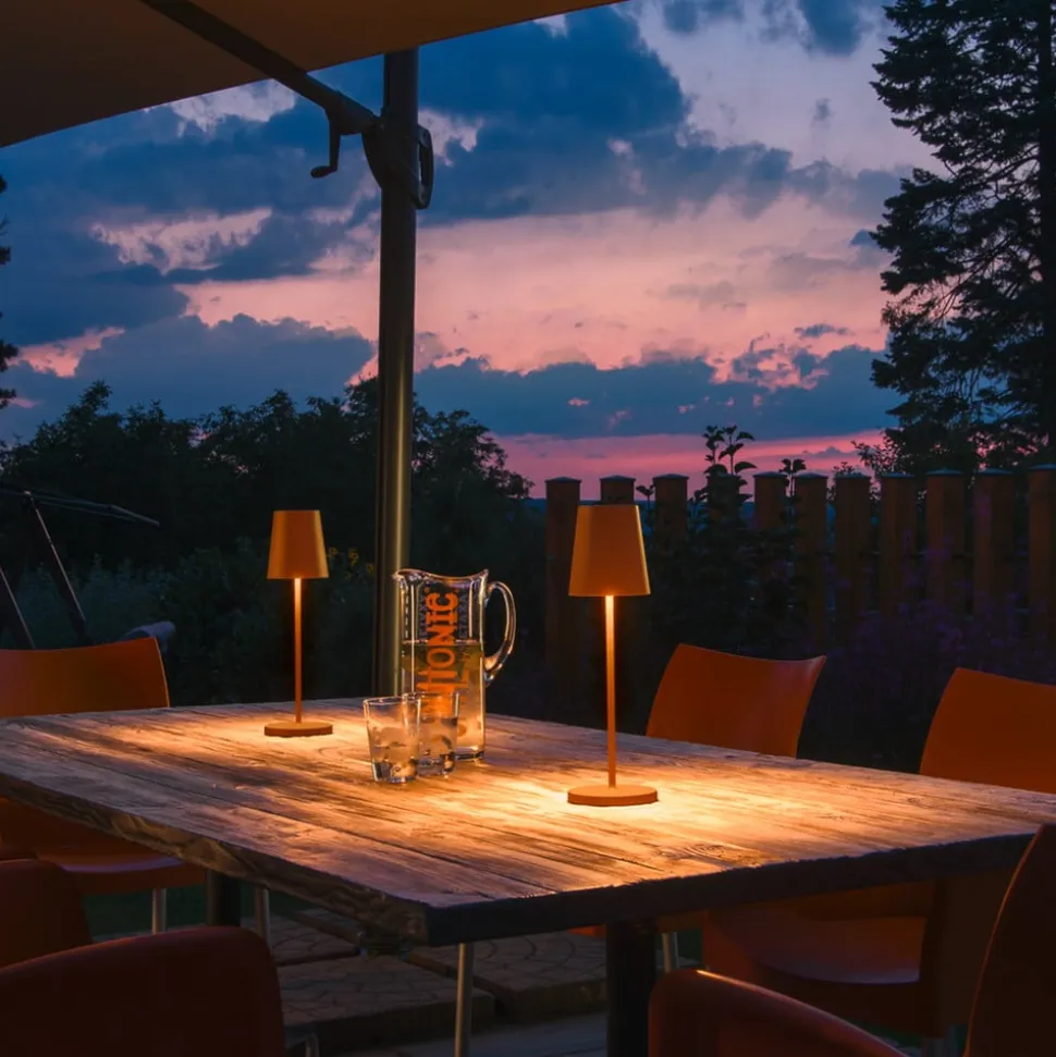 LED-bordlampe Vinolina Two med kontrollerbar lysfarve (CCT) Vinolina Two er navnet på bordlampen i aluminium af høj kvalitet, som også kan tages med udenfor takket være sin kapslingsgrad på IP65. Med sit tidløse design udsender den opadgående og nedadgående lys i 10 timer på en enkelt opladning, og farvetemperaturen kan indstilles til tre varmhvide niveauer via en CCT-kontakt. Ladestation og USB-kabel er inkluderet i leveringsomfanget – Udstyret med dæmper