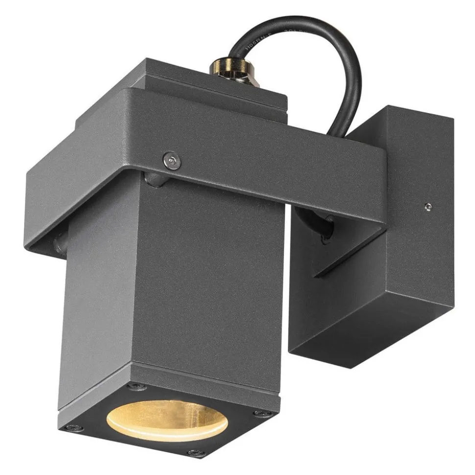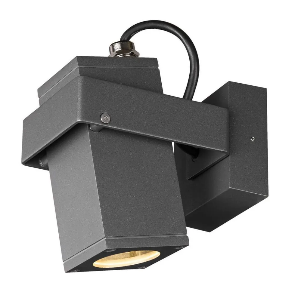 Moderne Theo Bracket udendørs vægspot med roterende og drejeligt lyshoved Monteret på husfacaden eller på et lille haveskur giver Theo Bracket udendørs vægspot en præcis belysning. Til det formål er spotlampen udstyret med både et roterende og et drejeligt lyshoved. Takket være det moderne og kantede design i antracit passer den harmonisk ind i moderne udendørsområder uden at blive for meget af et fokuspunkt. Det anbefales at bruge en LED-lyskilde til effektiv belysning (se tilbehør).