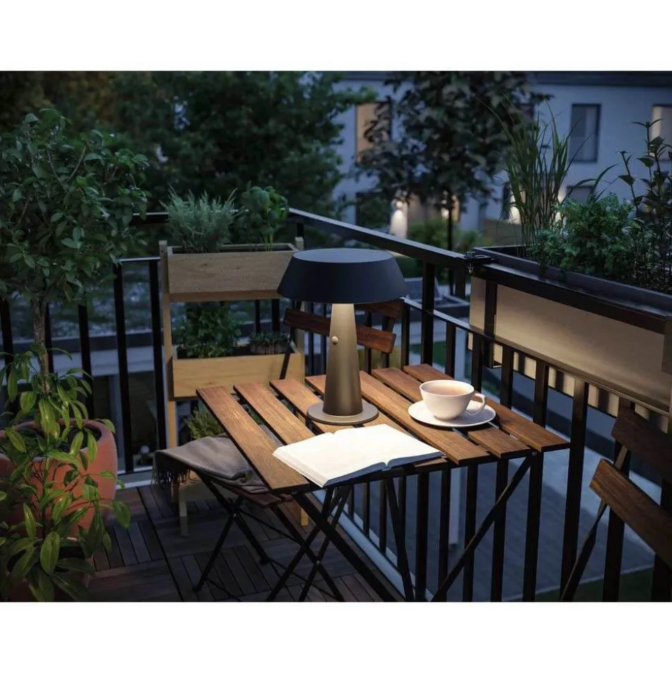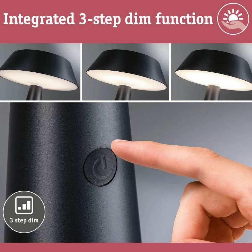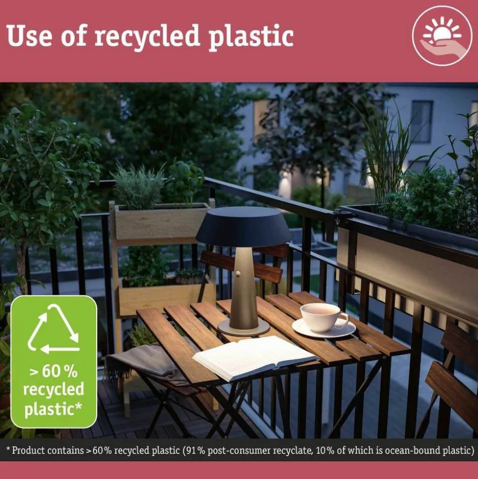 Soala Solcelle Lampe Anthracite – Paulmann er den perfekte kombination af bæredygtighed og fleksibilitet i en stilfuld bordlampe. Som en del af Paulmanns sortiment af solcellelamper, tilbyder denne portable lampe en miljøvenlig løsning til både indendørs og udendørs brug. Fremstillet af over 60% genbrugsplast, er Soala ikke kun et bæredygtigt valg, men også et designmæssigt blikfang i sin elegante sorte farve. Med en højde på 30.6 cm og en diameter på 24.8 cm passer den perfekt til enhver indretning, hvad enten det er i stuen eller på terrassen. Det integrerede solpanel og den praktiske USB-C forbindelse sikrer, at du altid har en energibesparende lyskilde ved hånden. Med en varm hvid lysfarve på 2700 K og en 3-trins dæmpningsfunktion kan du skabe den ønskede atmosfære. Takket være IP44-beskyttelsen er lampen vejrbestandig og ideel til udendørs brug.