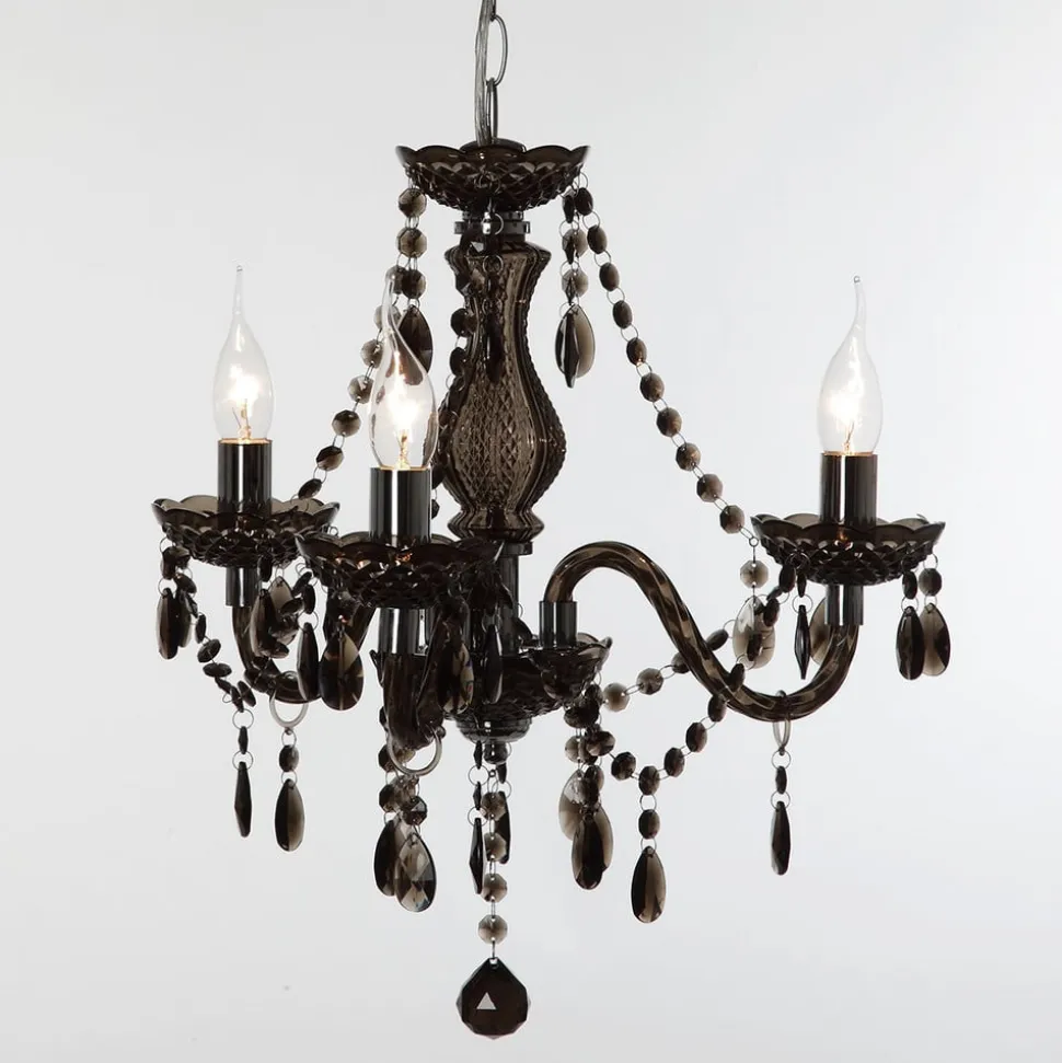 Sorte akrylglassten pryder Perdita-lysekronenPerdita-lysekronen præsenterer sig i et usædvanligt look med sin ramme lavet af sort, dekoreret akrylglas. Også sorte akrylglassten hænger ned fra lampearmene og reflekterer lyset fra lysekronen, som kan berige enhver stue. Den kan også installeres på et børneværelse – for hvilken lille pige vil ikke gerne have en rigtig lysekrone i sit eget kongerige?