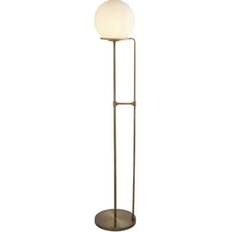Stuen, spisestuen eller studiet får et meget specielt møbel- og belysningsobjekt med denne lampe. standerlampe Sphere skaber en særlig behagelig atmosfære gennem den bløde belysning og kan også overbevise med sit antikke design. stel her er lavet af antik messing og har en usædvanlig form med en opal glasskærm i form af en kugle i den øvre ende. Herfra skinner lyset jævnt og blændfrit på alle sider og skaber en behagelig atmosfære og lysstyrke i rummet. Tænd og sluk udføres bekvemt ved hjælp af en fodkontakt på kablet.