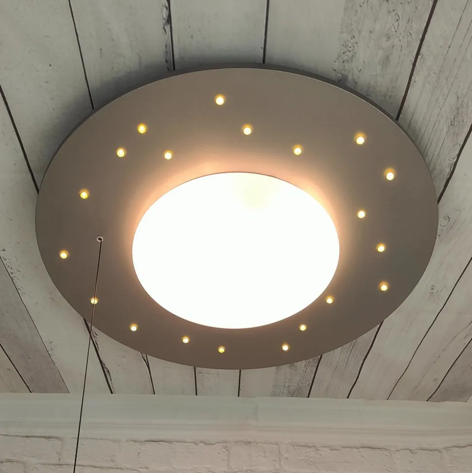 Med stjernehimmel: Starlight loftslampe med trækkontakt Starlight loftslampen er velegnet både som generel belysning i børneværelset og i sin funktion som stjernehimmel. 20 individuelle LED’er indlejret i loftspladen funkler som små stjerner. Hovedlyskilden er en E27-fatning (pære medfølger ikke, se tilbehør). Den kan deaktiveres med en trækkontakt, hvis du kun ønsker at lade stjernehimlen skinne. Den består af MDF-træ og plast og er lakeret i én farve.