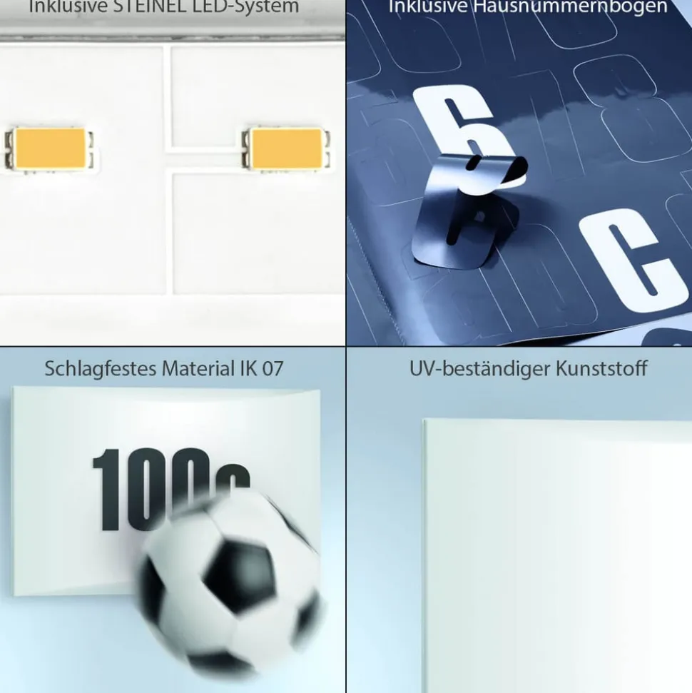 L 1 N LED udendørs vægarmatur kombinerer et usædvanligt elegant design med høj funktionalitet. Med sin ekstremt flade form er den et blikfang i enhver installationssituation og giver perfekt belysning om aftenen fra den indstillede skumringsgrænse. Armaturet slukker derefter automatisk ved daggry. Der medfølger selvklæbende husnumre og bogstaver.
