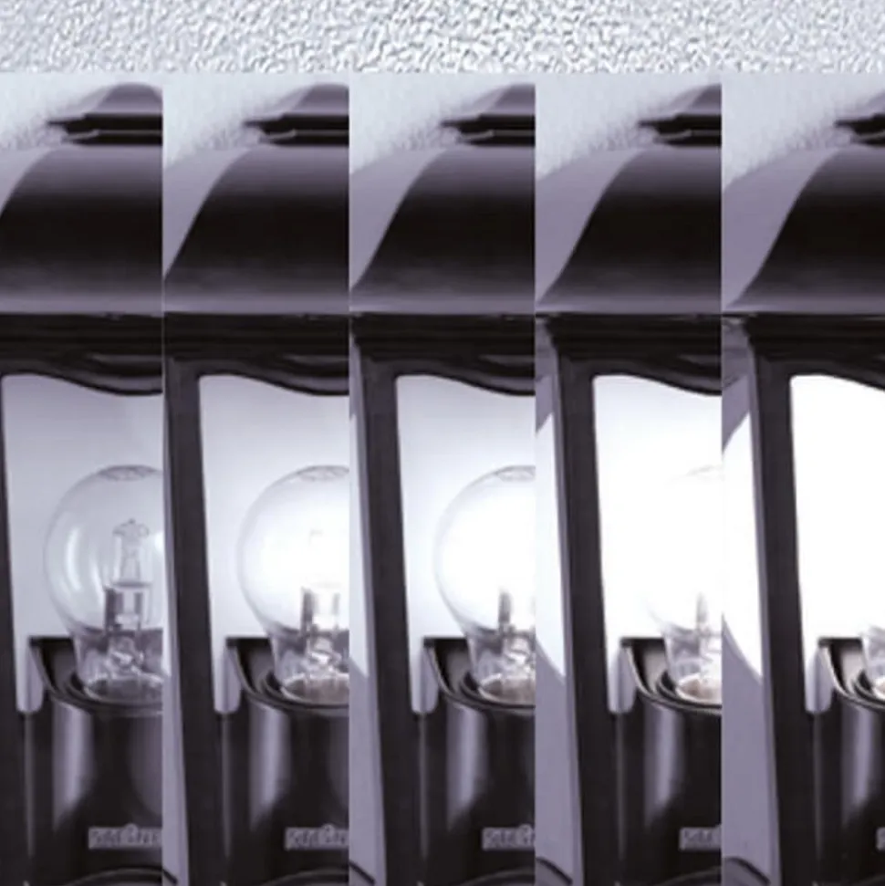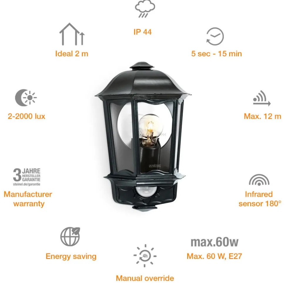 Udendørs væglampe L 190 S i klassisk lanterneform – udstyret med bevægelsesdetektorDen udendørs lampe L 190 S er lavet af rustfrit stål i høj kvalitet og udstyret med STEINEL multisensorteknologi. En blød lysstart er integreret. Den grundlæggende lysstyrke justeres via Watt-o-matic (0-50 %). Hvis der sker en bevægelse, lyser lyset med fuld styrke i den forudindstillede tid. Det kontinuerlige lys (4 timer) indstilles via hovedafbryderen. Detekteringsområdet kan begrænses ved hjælp af afdækningspaneler (medfølger). Tider fra 5 sekunder til 15 minutter kan reguleres. Detekteringsvinklen er 180°, blændevinklen 90°. Der kan ikke anvendes sparepærer i L 190 S.- Indstilling af rækkevidden ved at dreje multilinsen til maks. 5 m til maks. 12 m- Lysvarighed samt skumringstærskel og lysstyrkeregulering kan indstilles via praktiske funktionstaster- Skumringsindstilling 2 – 2.000 lux- Kan ikke anvendes med sparepærer- Monteringshøjde maks. 4 m- Beskyttelsesklasse IP44