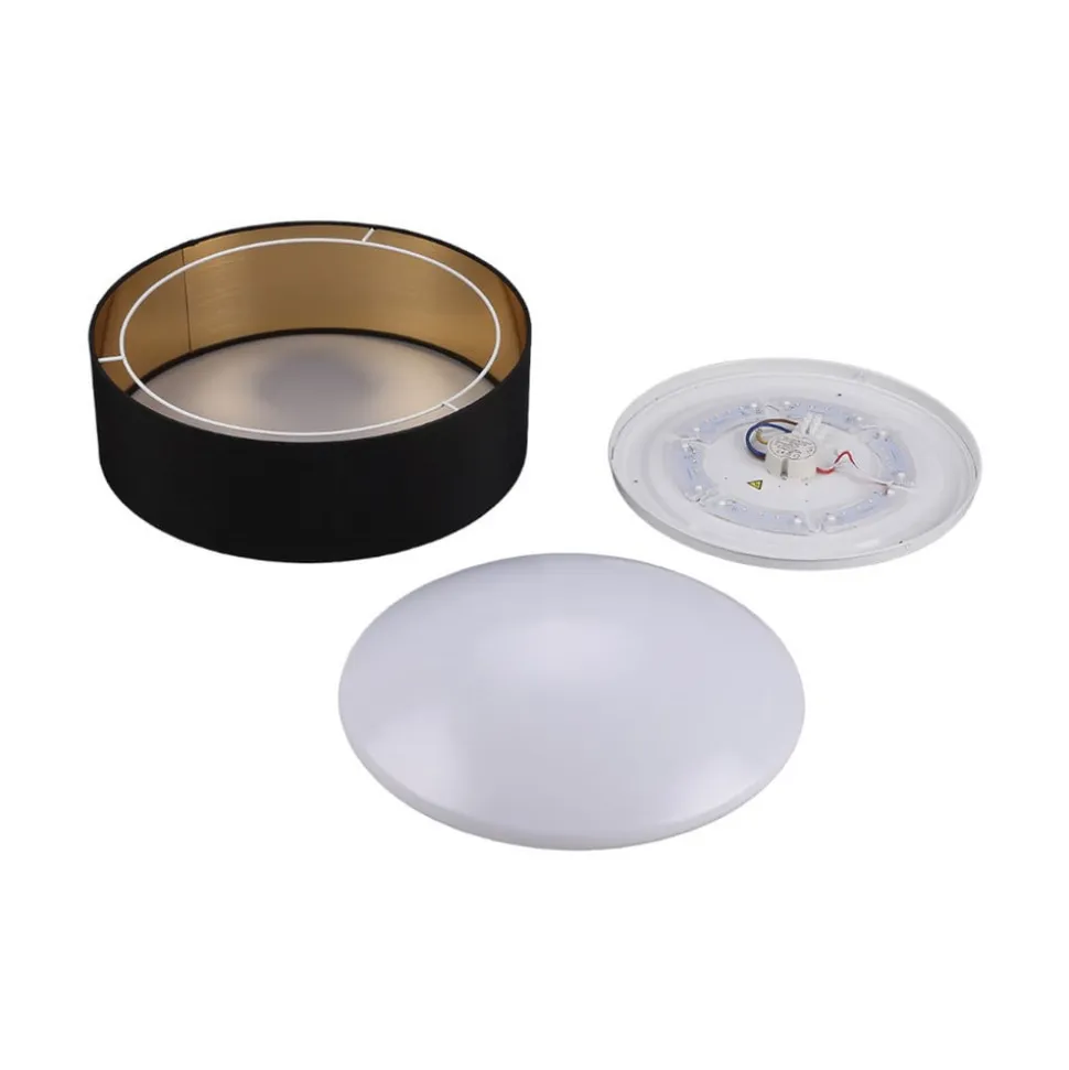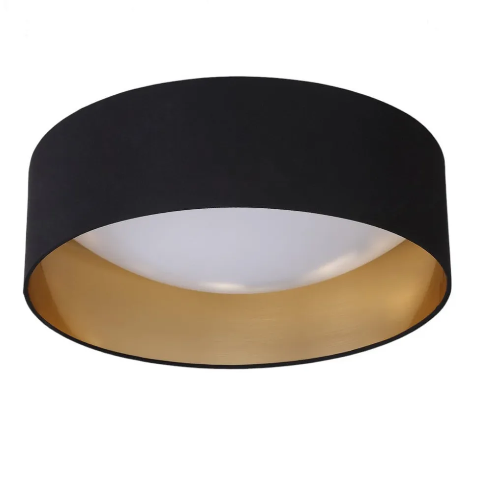 De her integrerede LED´er skinner i en varm hvid lysfarve og er samtidig særdeles energieffektive. Det betyder at den skaber et klart lys, som giver en god belysning samtidig med, at den kun forbruger lidt strøm. Loftslampens stofoverflade er holdt i diskret sort, som scorer point takket være dens tidløse karakter. Det er indersiden på den cylinderformede skærm, som er iøjnefaldende idet den er holdt i en guldtone, der ved nærmere eftersyn ser ud som over metaloverfladen er blevet børstet. Det er en attraktiv lyskilde som har noget helt særligt, og som ikke kun ser flot ud i stue og soveværelse, men også i gangen.