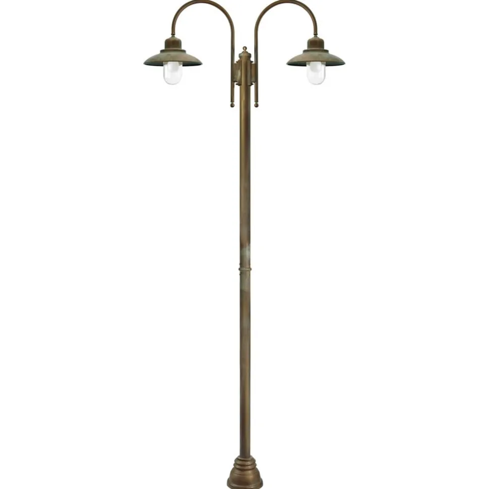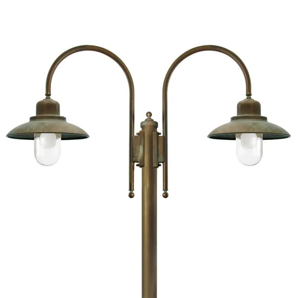Casale – et 270 cm højt stolpearmatur med to lys i antik messing Rummelig, klar belysning af parker, udendørsområder ved forskellige faciliteter som hospitaler, plejeinstitutioner osv. eller endda haven derhjemme – intet problem med det 270 cm høje stolpearmatur Casale med to lys. Det store stolpearmatur er også velegnet til brug ved kysten, da armaturet af høj kvalitet er havvandsbestandigt. Lyset dæmpes ikke af de klare glasskærme, så det kan lyse kraftigt og bredt og sikkert op på et stort område. Casale-mastelyset er også velegnet til brug med energibesparende lamper eller LED-lamper.