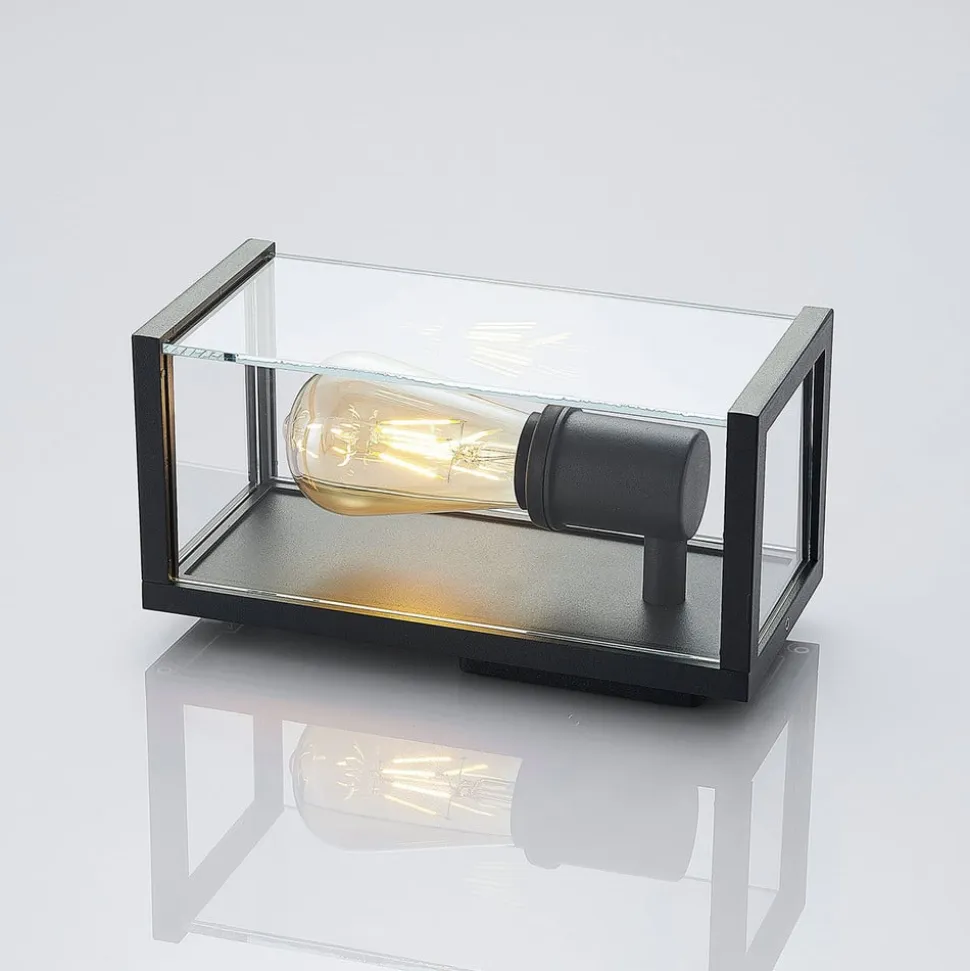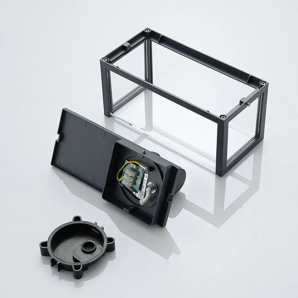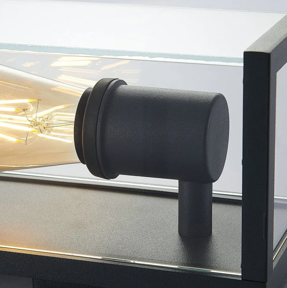 Mørkegrå Susanne udendørs væglampe med glasindsatser i et praktisk sæt på 2 Med Susanne udendørs væglampe får pæren en særlig visuel tilstedeværelse, da fronten og begge sider er glaserede, så kun de klare ruder adskiller lampen fra omgivelserne. Der skal bruges A60-lamper med E27-sokkel. De kan have glødetrådslook og LED-teknologi. Ud over de hærdede glasruder har armaturet til udendørs brug også en mørkegrå ramme af trykstøbt aluminium, som fuldender det moderne look. Lampen leveres i et sæt med 2 stk.