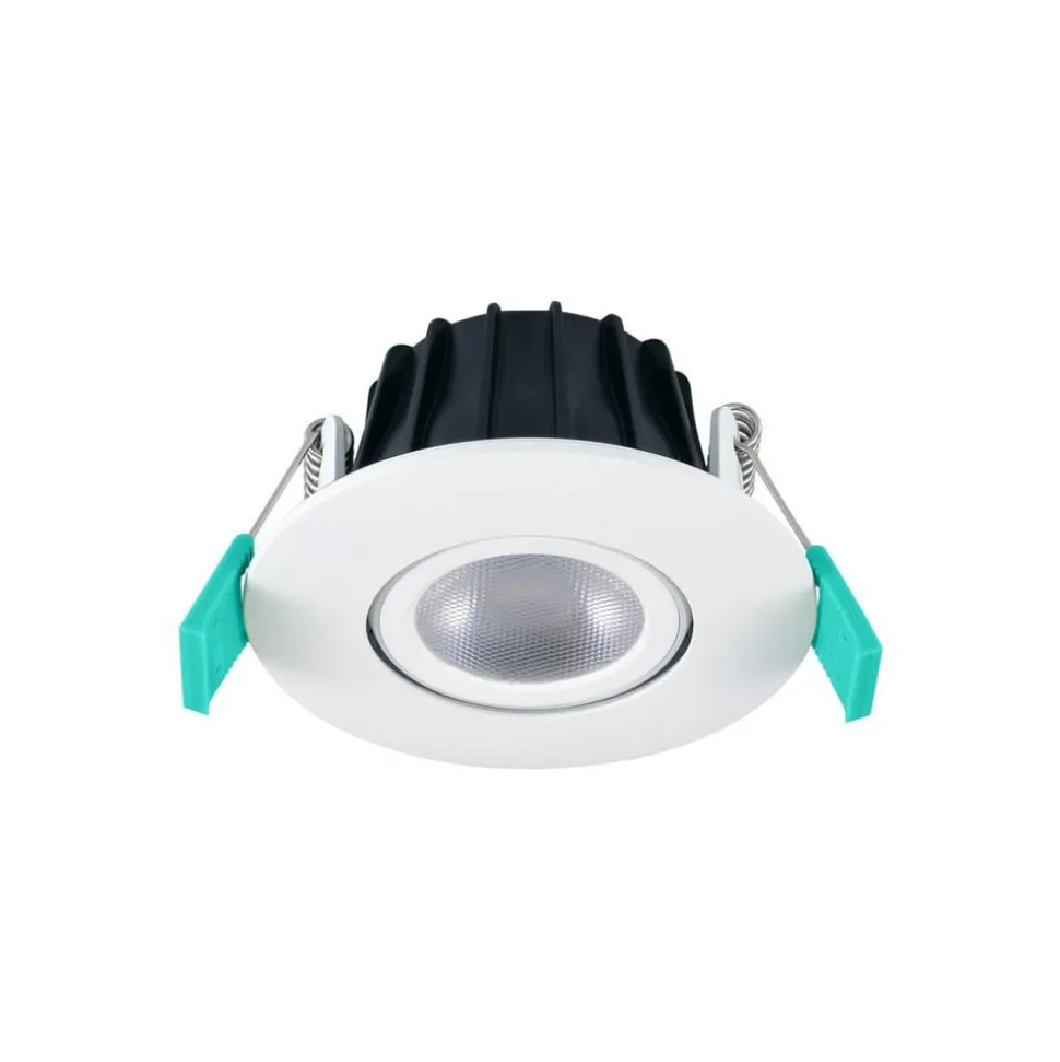 Rundt Obico 68 LED-indbygningsarmatur til udendørs og indendørs områder, IP65 Obico 68 LED-indbygningsspot er 2-akset justerbar (vandret rotation 360°, lodret hældning 30°) – 3 CCT-muligheder på 2.700-3.000-4.000 K justerbar ved installation – Dæmpbar med bagkantstyret LED-dæmper – IP65-front – Loop-in/loop-out-terminaler til hurtig ledningsføring – Klar linse – Lufttæt – Kan dækkes direkte med isolerende materiale i henhold til EN60598-1