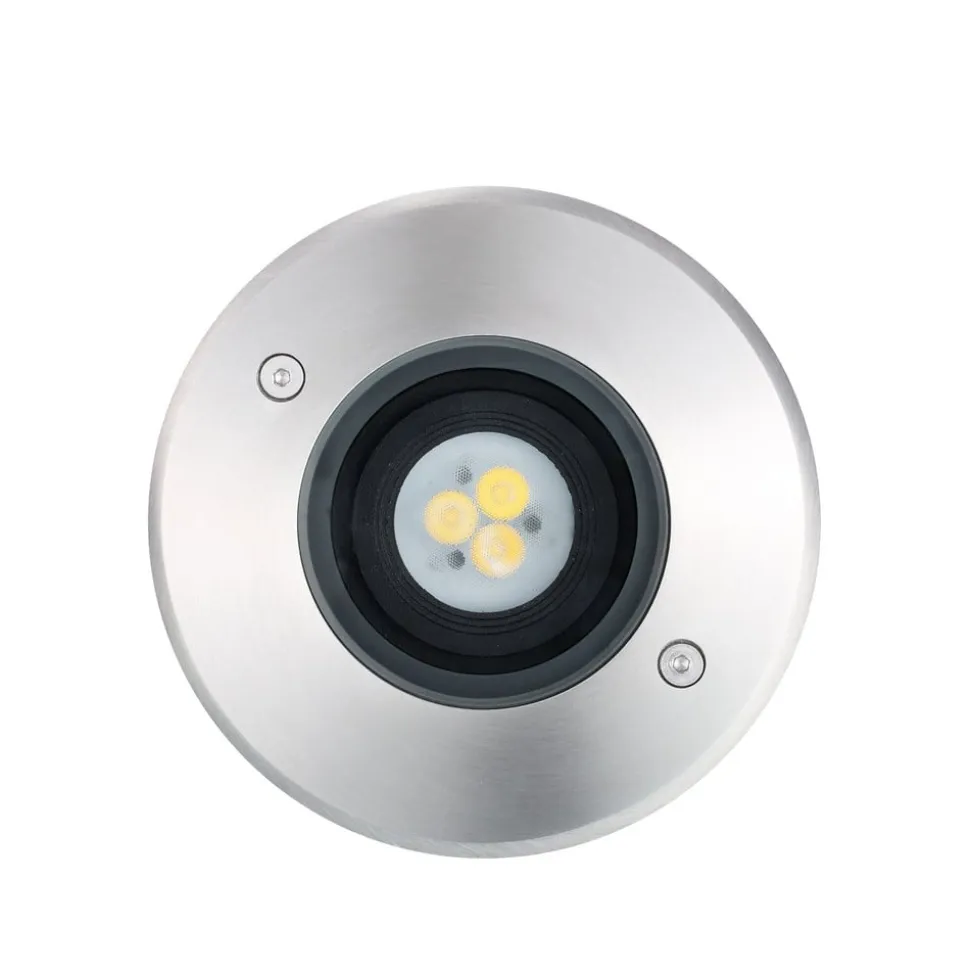 Drive-over LED nedgravningslampe Interrata Den runde nedgravningslampe Interrata med et +/-30° justerbart lysmodul kan køres over for trykbelastninger op til 2000 kg (20 kN) og er udstyret med 2 m 3×1 mm2 flydeledning og installationsrør, aluminiumshus med trimring i rustfrit stål (SS316) og klar glasdiffusor – ikke dæmpbar