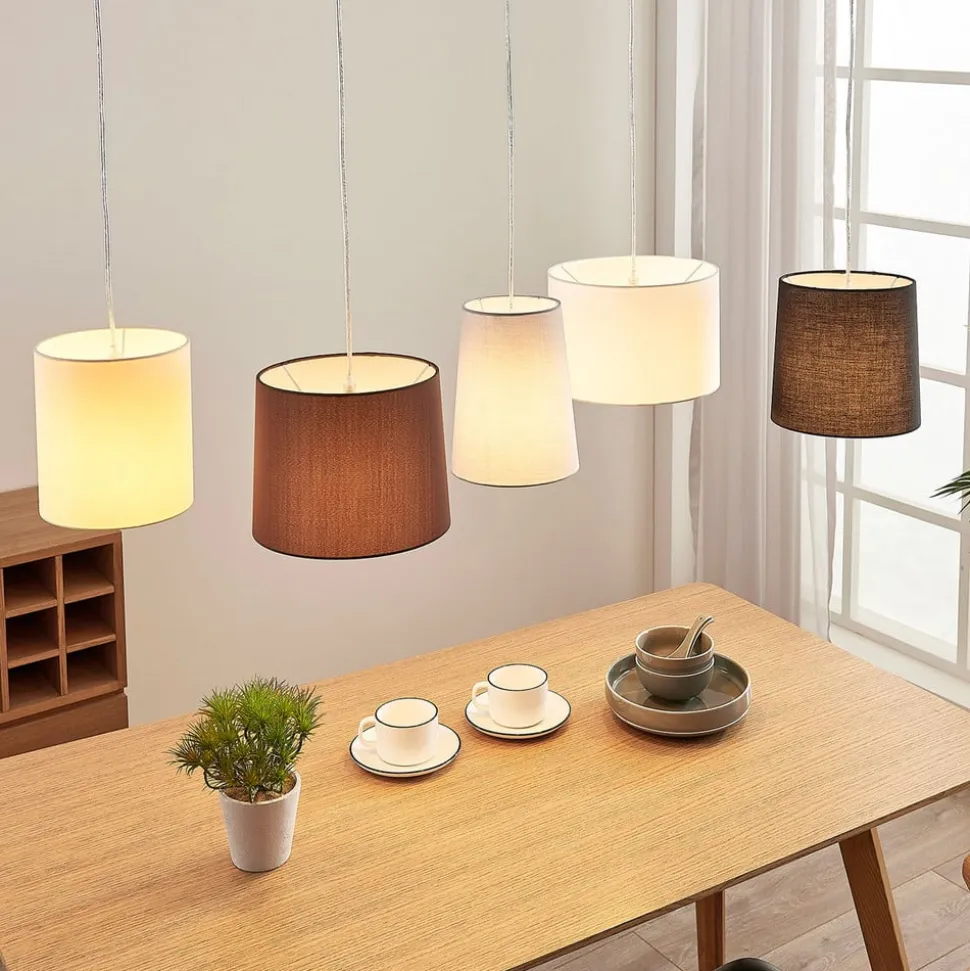 Tekstilhængelampe Hermina med fem skærme i forskellige former og farver