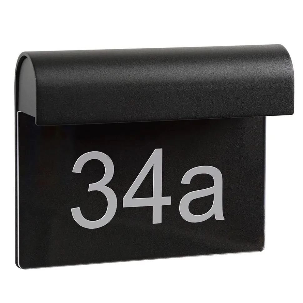 Thesi – tidløs LED-husnummerlampe, sort Thesi LED-husnummerlampen skaber en smuk kontrast til de normalt lyse udvendige facader. Leveringen omfatter lysende selvklæbende cifre, der skiller sig ud fra det sorte aluminium og derfor er let læselige. Et behageligt, varmt hvidt lys hjælper også med diskret at oplyse indgangspartiet og eventuelle trin i mørket. En husnummerplade til påklæbning er inkluderet.
