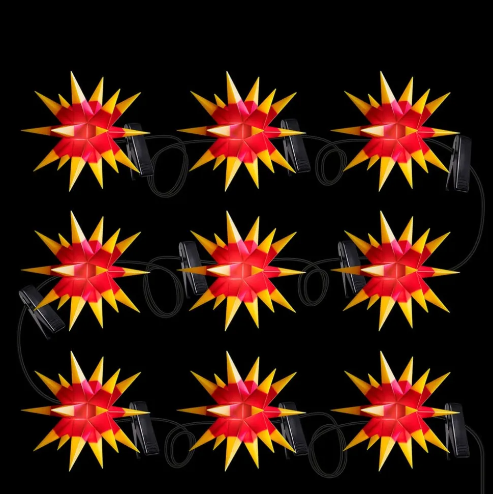 Røde 18-punkts stjerner med gule spidser, som giver stjerneskønheden en særlig effekt, er opstillet med 100 cm mellemrum på denne lyskæde, der er velegnet til indendørs og udendørs brug. Stjernerne er lavet af plastik, som er modstandsdygtigt over for frost og regn. Allerede når de er slukket, imponerer stjernerne med deres særlige form. Så snart lyset er tændt, lyser stjernerne i et varmt hvidt lys. Udstyret med sort kabel. Klemmer til fastgørelse af lyskæden, f.eks. til et træ eller en guirlande, er allerede inkluderet i leveringen. Der medfølger også en udendørs transformer.